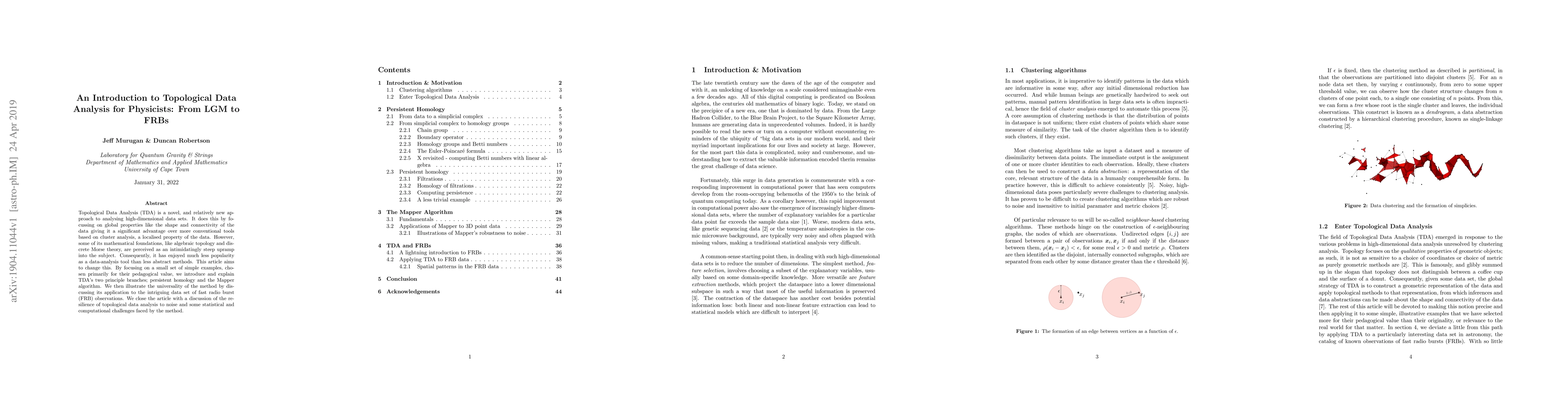 This paper introduces Topological Data Analysis (TDA) to physicists, focusing on its two key branches: persistent homology and the Mapper algorithm, to analyze high-dimensional data sets like Fast Radio Burst observations.