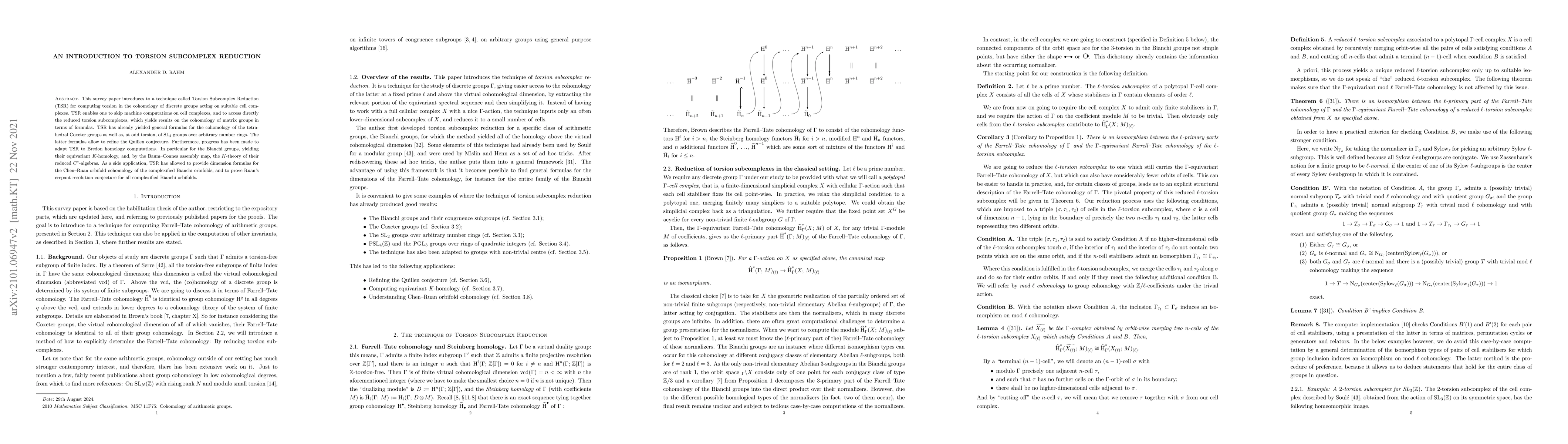 This survey paper introduces to a technique called Torsion Subcomplex Reduction (TSR) for computing torsion in the cohomology of discrete groups acting on suitable cell complexes. TSR enables one to skip machine computations on cell complexes, and to access directly the reduced torsion subcomplexes, which yields results on the cohomology of matrix groups in terms of formulas. TSR has already yielded general formulas for the cohomology of the tetrahedral Coxeter groups as well as, at odd torsion, of SL2 groups over arbitrary number rings. The latter formulas have allowed to refine the Quillen conjecture. Furthermore, progress has been made to adapt TSR to Bredon homology computations. In particular for the Bianchi groups, yielding their equivariant K-homology, and, by the Baum-Connes assembly map, the K-theory of their reduced C *-algebras. As a side application, TSR has allowed to provide dimension formulas for the Chen-Ruan orbifold cohomology of the complexified Bianchi orbifolds, and to prove Ruan's crepant resolution conjecture for all complexified Bianchi orbifolds.