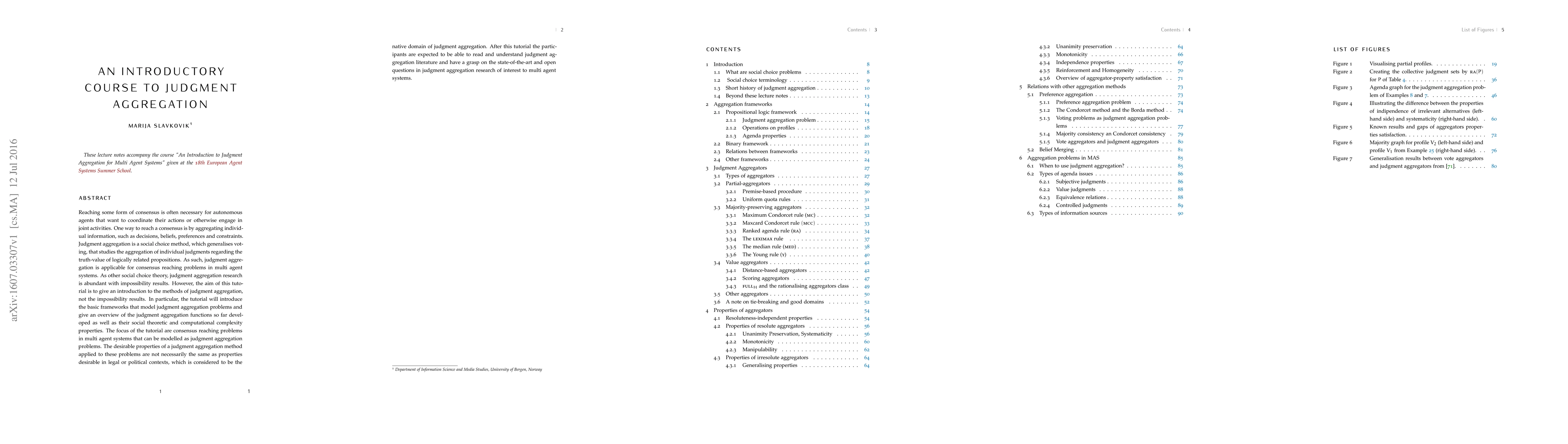 This paper provides an introductory course to judgment aggregation, focusing on methods for aggregating individual judgments to reach consensus in multi-agent systems. It outlines the basic frameworks and functions developed, emphasizing their applicability and properties in the context of consensus-reaching problems.