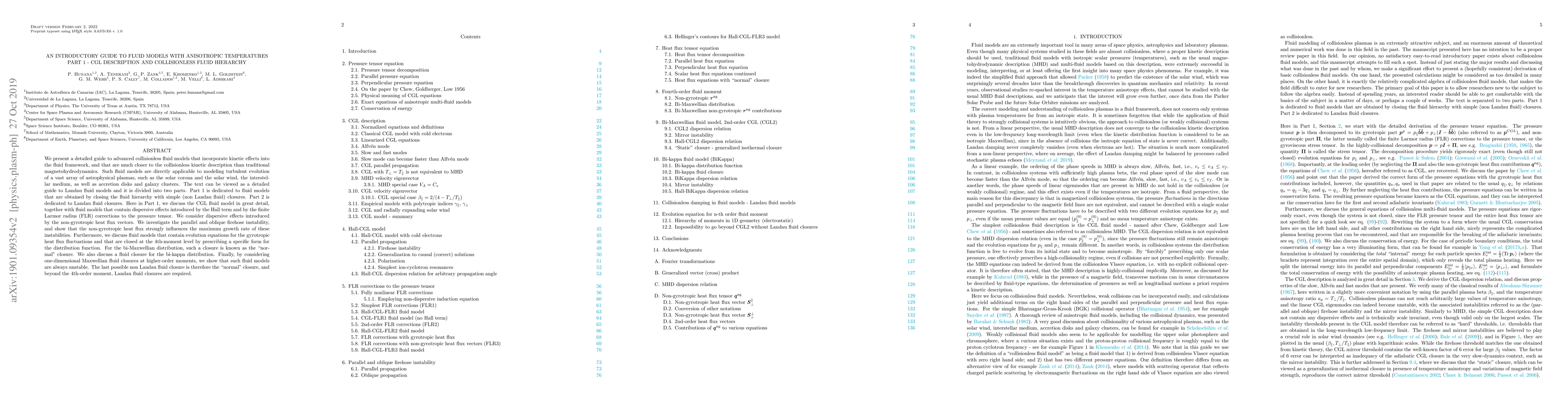 We present a detailed guide to advanced collisionless fluid models that incorporate kinetic effects into the fluid framework, and that are much closer to the collisionless kinetic description than traditional magnetohydrodynamics. Such fluid models are directly applicable to modeling turbulent evolution of a vast array of astrophysical plasmas, such as the solar corona and the solar wind, the interstellar medium, as well as accretion disks and galaxy clusters. The text can be viewed as a detailed guide to Landau fluid models and it is divided into two parts. Part 1 is dedicated to fluid models that are obtained by closing the fluid hierarchy with simple (non Landau fluid) closures. Part 2 is dedicated to Landau fluid closures. Here in Part 1, we discuss the CGL fluid model in great detail, together with fluid models that contain dispersive effects introduced by the Hall term and by the finite Larmor radius (FLR) corrections to the pressure tensor. We consider dispersive effects introduced by the non-gyrotropic heat flux vectors. We investigate the parallel and oblique firehose instability, and show that the non-gyrotropic heat flux strongly influences the maximum growth rate of these instabilities. Furthermore, we discuss fluid models that contain evolution equations for the gyrotropic heat flux fluctuations and that are closed at the 4th-moment level by prescribing a specific form for the distribution function. For the bi-Maxwellian distribution, such a closure is known as the "normal" closure. We also discuss a fluid closure for the bi-kappa distribution. Finally, by considering one-dimensional Maxwellian fluid closures at higher-order moments, we show that such fluid models are always unstable. The last possible non Landau fluid closure is therefore the "normal" closure, and beyond the 4th-order moment, Landau fluid closures are required.
