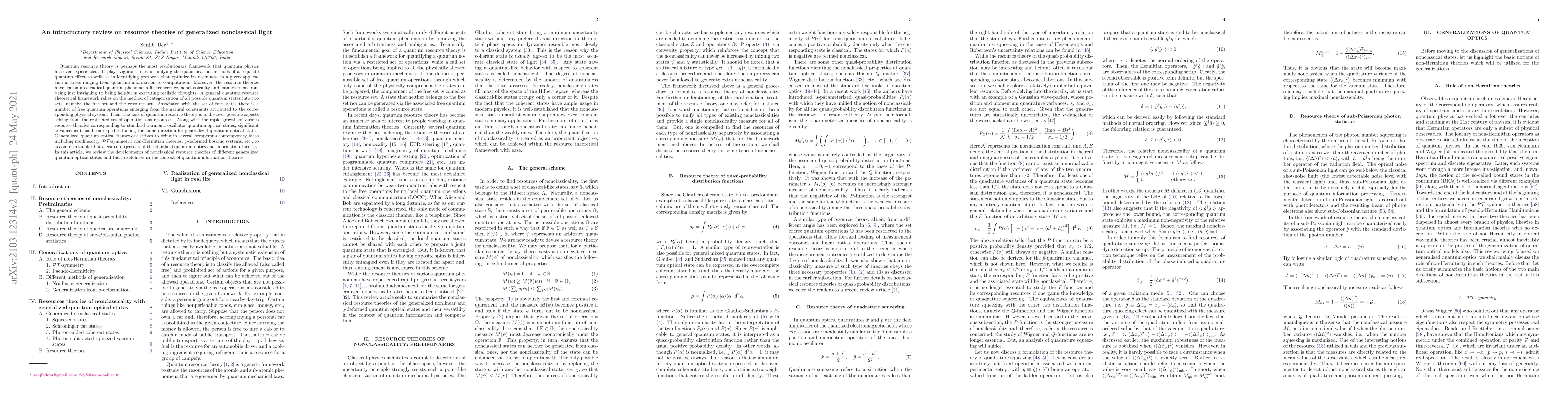 This paper provides an introductory review of the resource theories of generalized nonclassical light, emphasizing the role of quantum resource theory in categorizing quantum states and operations. It highlights advancements in generalized quantum optical frameworks incorporating nonlinearity, $\mathcal{PT}$-symmetric non-Hermitian theories, and $q$-deformed bosonic systems, and discusses their applications in quantum information.
