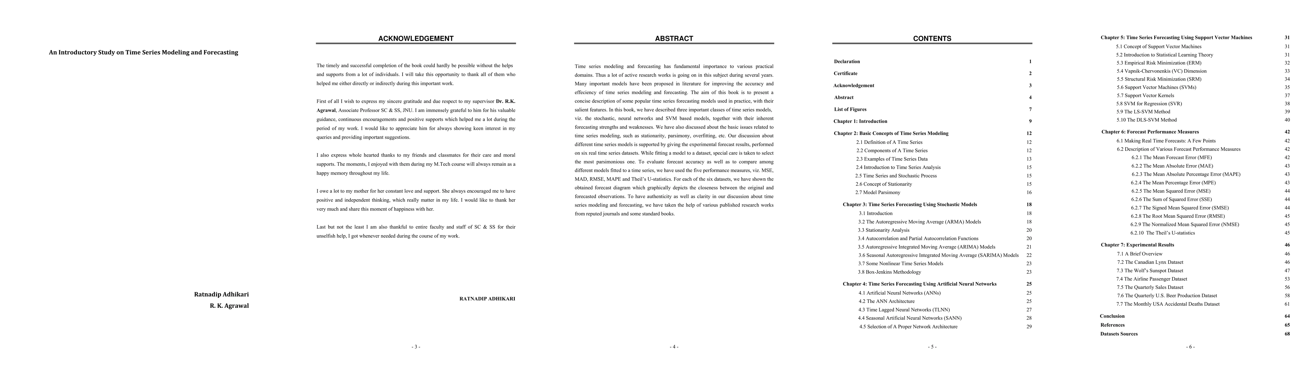 This paper provides an overview of popular time series forecasting models, including stochastic, neural networks, and SVM-based models, highlighting their strengths and weaknesses. Experimental results on six real datasets demonstrate the performance of these models using metrics like MSE, MAD, RMSE, MAPE, and Theil's U-statistics, with a focus on selecting the most parsimonious model.