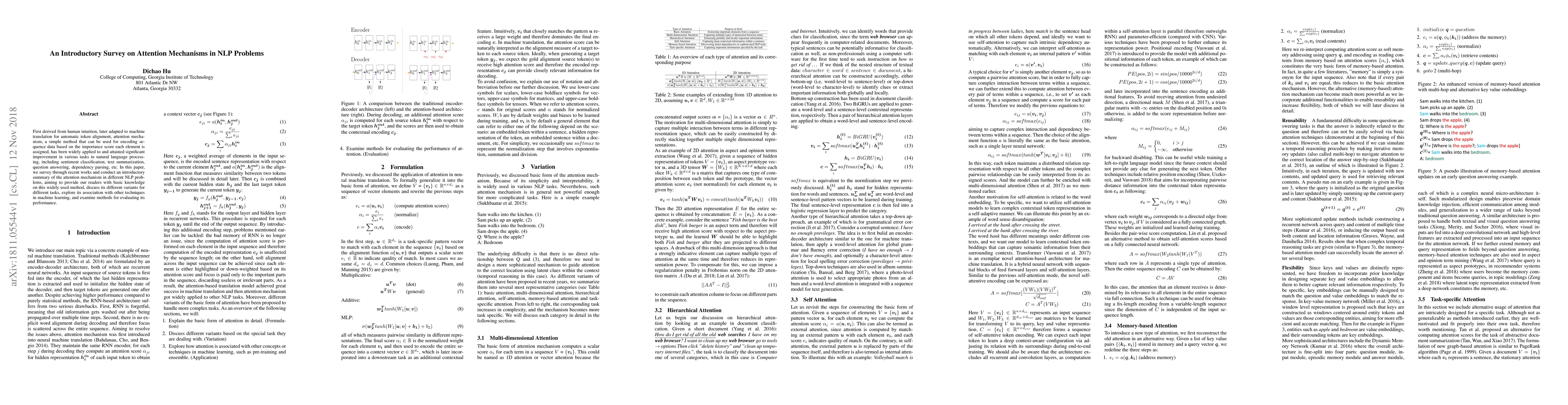 First derived from human intuition, later adapted to machine translation for automatic token alignment, attention mechanism, a simple method that can be used for encoding sequence data based on the importance score each element is assigned, has been widely applied to and attained significant improvement in various tasks in natural language processing, including sentiment classification, text summarization, question answering, dependency parsing, etc. In this paper, we survey through recent works and conduct an introductory summary of the attention mechanism in different NLP problems, aiming to provide our readers with basic knowledge on this widely used method, discuss its different variants for different tasks, explore its association with other techniques in machine learning, and examine methods for evaluating its performance.