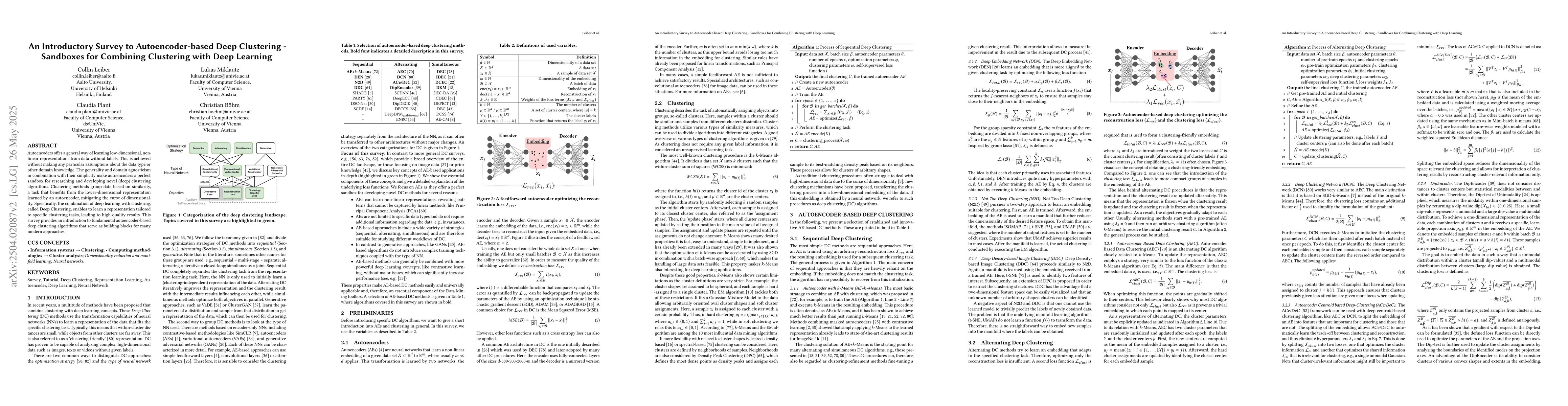 The paper's main technical contribution is the introduction and explanation of fundamental autoencoder-based deep clustering algorithms, serving as foundational knowledge for modern clustering approaches.