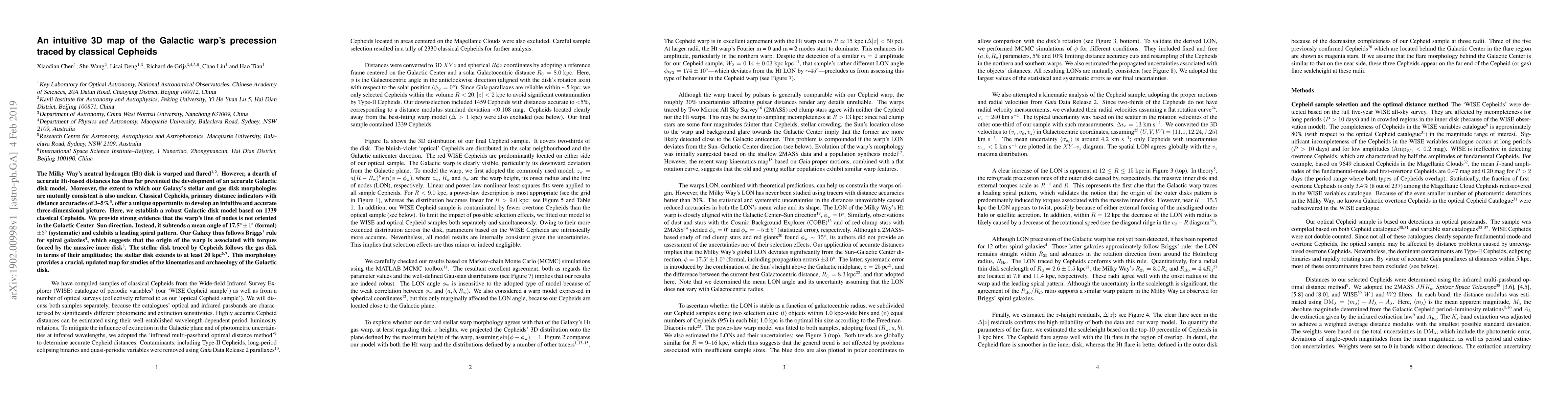 The Milky Way's neutral hydrogen (HI) disk is warped and flared. However, a dearth of accurate HI-based distances has thus far prevented the development of an accurate Galactic disk model. Moreover, the extent to which our Galaxy's stellar and gas disk morphologies are mutually consistent is also unclear. Classical Cepheids, primary distance indicators with distance accuracies of 3-5%, offer a unique opportunity to develop an intuitive and accurate three-dimensional picture. Here, we establish a robust Galactic disk model based on 1339 classical Cepheids. We provide strong evidence that the warp's line of nodes is not oriented in the Galactic Center-Sun direction. Instead, it subtends a mean angle of 17.5 \pm 1 (formal) \pm 3 (systematic) and exhibits a leading spiral pattern. Our Galaxy thus follows Briggs' rule for spiral galaxies, which suggests that the origin of the warp is associated with torques forced by the massive inner disk. The stellar disk traced by Cepheids follows the gas disk in terms of their amplitudes; the stellar disk extends to at least 20 kpc. This morphology provides a crucial, updated map for studies of the kinematics and archaeology of the Galactic disk.