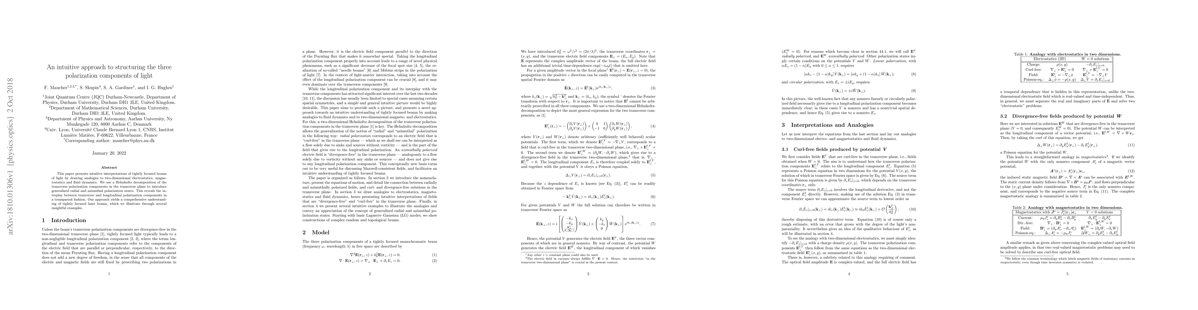 This paper presents intuitive interpretations of tightly focused beams of light by drawing analogies to two-dimensional electrostatics, magnetostatics and fluid dynamics. We use a Helmholtz decomposition of the transverse polarization components in the transverse plane to introduce generalized radial and azimuthal polarization states. This reveals the interplay between transverse and longitudinal polarization components in a transparent fashion. Our approach yields a comprehensive understanding of tightly focused laser beams, which we illustrate through several insightful examples.