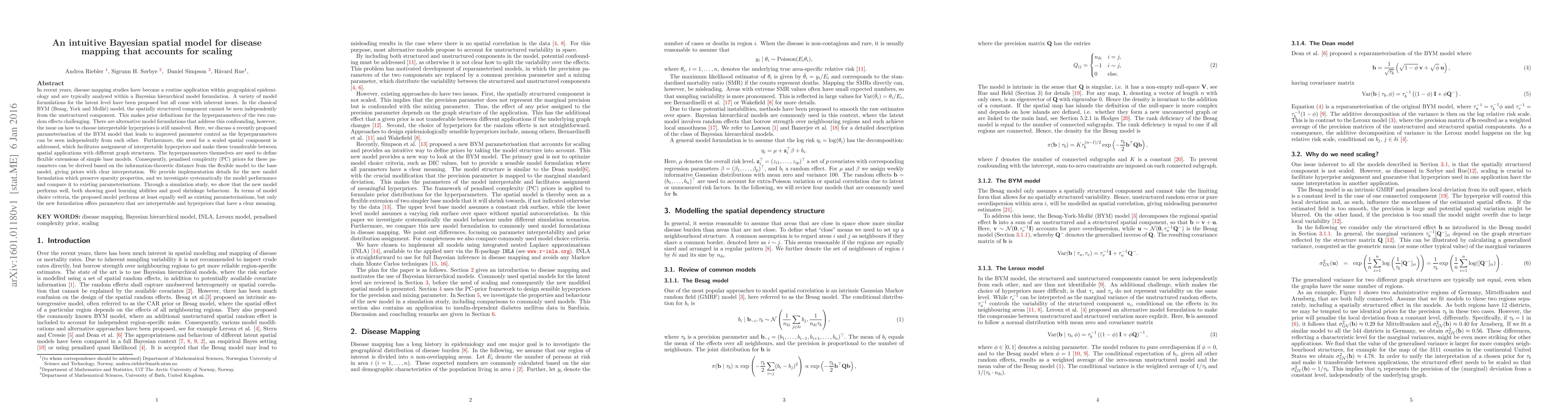 The paper proposes an intuitive Bayesian spatial model for disease mapping that accounts for scaling, addressing issues in the classical BYM model where structured and unstructured components cannot be separated for independent hyperparameter prior definitions. The new model formulation facilitates assignment of interpretable hyperpriors and preserves sparsity properties.