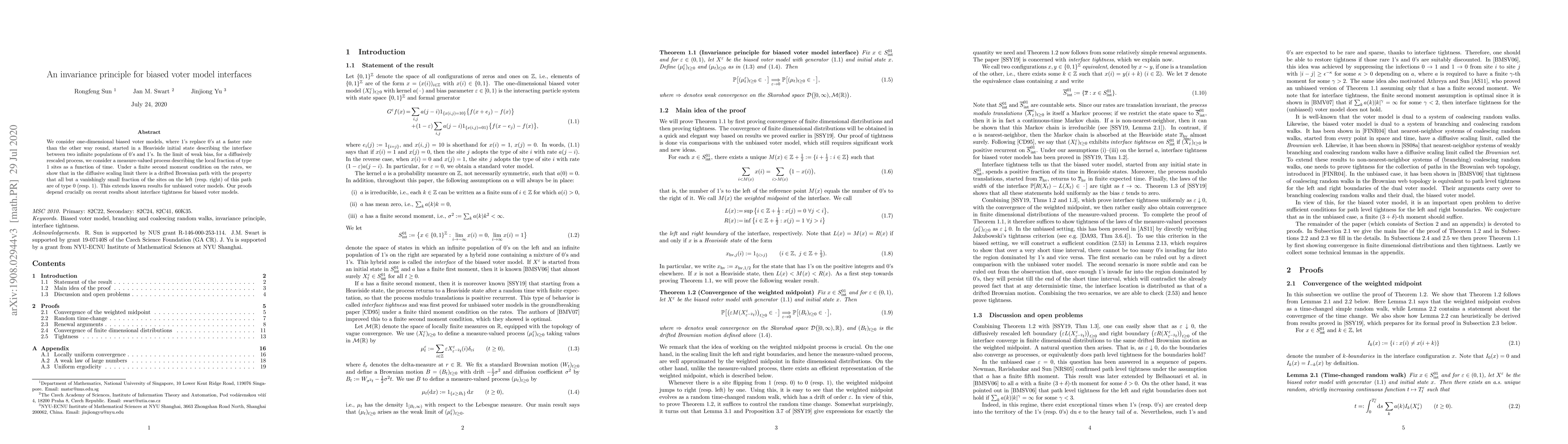 This paper establishes an invariance principle for one-dimensional biased voter models, showing that under weak bias and diffusive rescaling, the interface between populations of 0's and 1's converges to a drifted Brownian motion, extending results from unbiased models. The proof leverages recent findings on interface tightness for biased voter models.