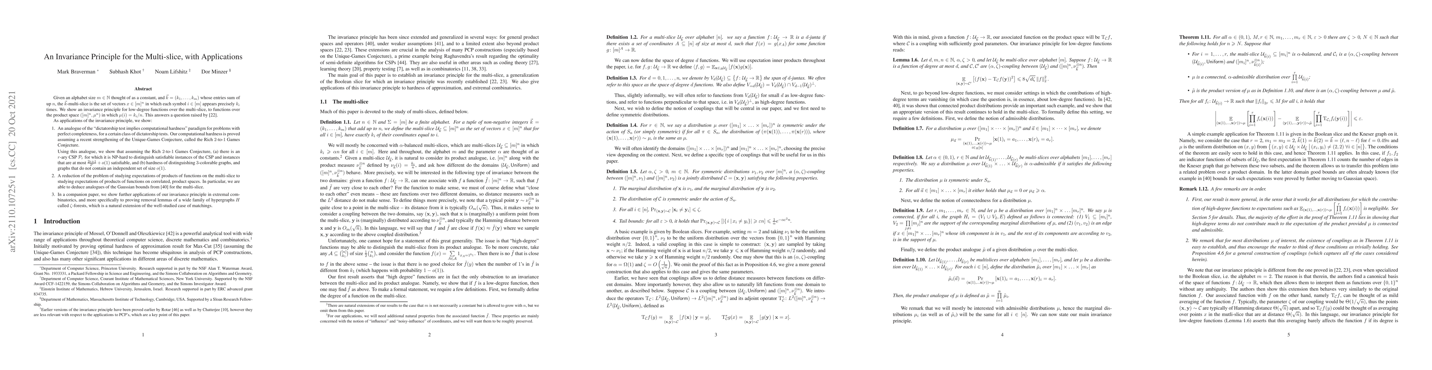 Given an alphabet size $m\in\mathbb{N}$ thought of as a constant, and $\vec{k} = (k_1,\ldots,k_m)$ whose entries sum of up $n$, the $\vec{k}$-multi-slice is the set of vectors $x\in [m]^n$ in which each symbol $i\in [m]$ appears precisely $k_i$ times. We show an invariance principle for low-degree functions over the multi-slice, to functions over the product space $([m]^n,\mu^n)$ in which $\mu(i) = k_i/n$. This answers a question raised by Filmus et al. As applications of the invariance principle, we show: 1. An analogue of the "dictatorship test implies computational hardness" paradigm for problems with perfect completeness, for a certain class of dictatorship tests. Our computational hardness is proved assuming a recent strengthening of the Unique-Games Conjecture, called the Rich $2$-to-$1$ Games Conjecture. Using this analogue, we show that assuming the Rich $2$-to-$1$ Games Conjecture, (a) there is an $r$-ary CSP $\mathcal{P}_r$ for which it is NP-hard to distinguish satisfiable instances of the CSP and instances that are at most $\frac{2r+1}{2^r} + o(1)$ satisfiable, and (b) hardness of distinguishing $3$-colorable graphs, and graphs that do not contain an independent set of size $o(1)$. 2. A reduction of the problem of studying expectations of products of functions on the multi-slice to studying expectations of products of functions on correlated, product spaces. In particular, we are able to deduce analogues of the Gaussian bounds from \cite{MosselGaussian} for the multi-slice. 3. In a companion paper, we show further applications of our invariance principle in extremal combinatorics, and more specifically to proving removal lemmas of a wide family of hypergraphs $H$ called $\zeta$-forests, which is a natural extension of the well-studied case of matchings.