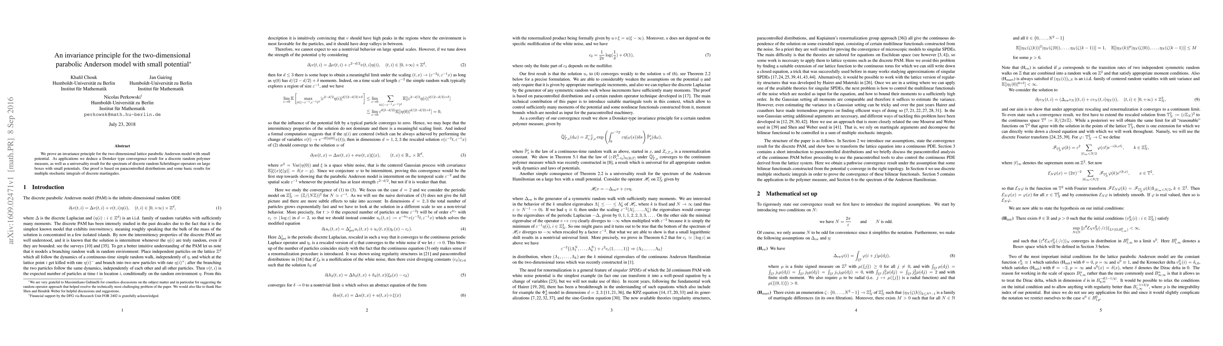 This paper proves an invariance principle for the two-dimensional parabolic Anderson model with small potential, establishing a Donsker type convergence result for a discrete random polymer measure and a universality result for the spectrum of discrete random Schrödinger operators. The proof utilizes paracontrolled distributions and results for multiple stochastic integrals of discrete martingales.