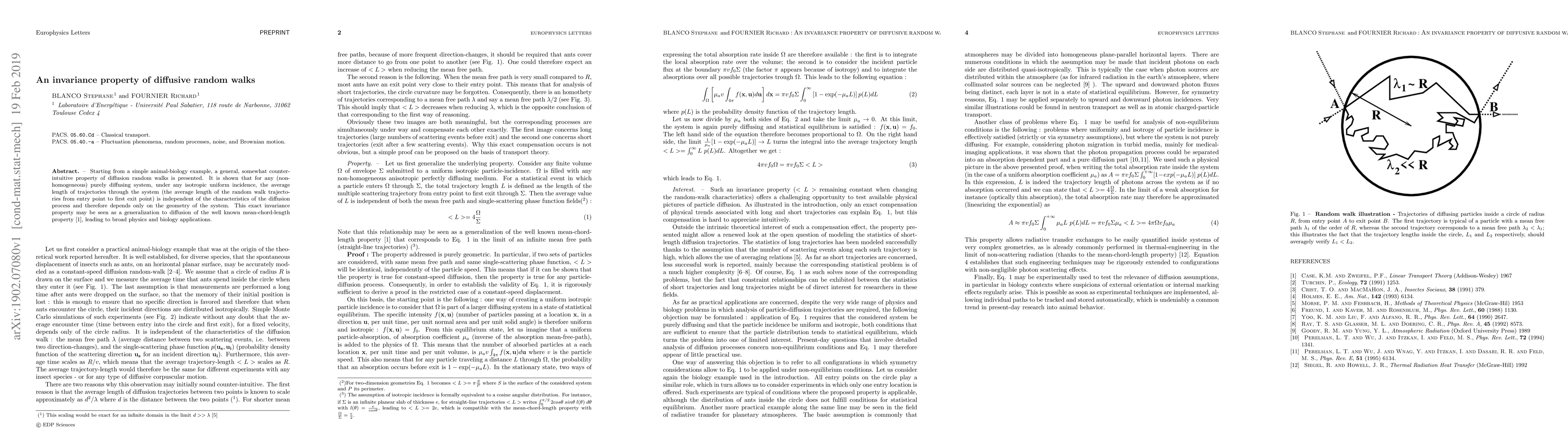 Starting from a simple animal-biology example, a general, somewhat counter-intuitive property of diffusion random walks is presented. It is shown that for any (non-homogeneous) purely diffusing system, under any isotropic uniform incidence, the average length of trajectories through the system (the average length of the random walk trajecto-ries from entry point to first exit point) is independent of the characteristics of the diffusion process and therefore depends only on the geometry of the system. This exact invariance property may be seen as a generalization to diffusion of the well known mean-chord-length property [1], leading to broad physics and biology applications. Let us first consider a practical animal-biology example that was at the origin of the theoretical work reported hereafter. It is well established, for diverse species, that the spontaneous displacement of insects such as ants, on an horizontal planar surface, may be accurately mod-eled as a constant-speed diffusion random-walk [2-4]. We assume that a circle of radius R is drawn on the surface and we measure the average time that ants spend inside the circle when they enter it (see Fig. 1). The last assumption is that measurements are performed a long time after ants were dropped on the surface, so that the memory of their initial position is lost : this is enough to ensure that no specific direction is favored and therefore that when ants encounter the circle, their incident directions are distributed isotropically. Simple Monte Carlo simulations of such experiments (see Fig. 2) indicate without any doubt that the average encounter time (time between entry into the circle and first exit), for a fixed velocity, depends only of the circle radius. It is independent of the characteristics of the diffusion walk : the mean free path $\lambda$ (average distance between two scattering events, i.e. between two direction-changes), and the single-scattering phase function p(u s , u i) (probability density function of the scattering direction u s for an incident direction u i). Furthermore, this average time scales as R/v, which means that the average trajectory-length < L > scales as R. The average trajectory-length would therefore be the same for different experiments with any insect species-or for any type of diffusive corpuscular motion. There are two reasons why this observation may initially sound counter-intuitive. The first reason is that the average length of diffusion trajectories between two points is known to scale approximately as d 2 /$\lambda$ where d is the distance between the two points (1). For shorter mean (1)This scaling would be exact for an infinite domain in the limit d >> $\lambda$ [5] c EDP Sciences