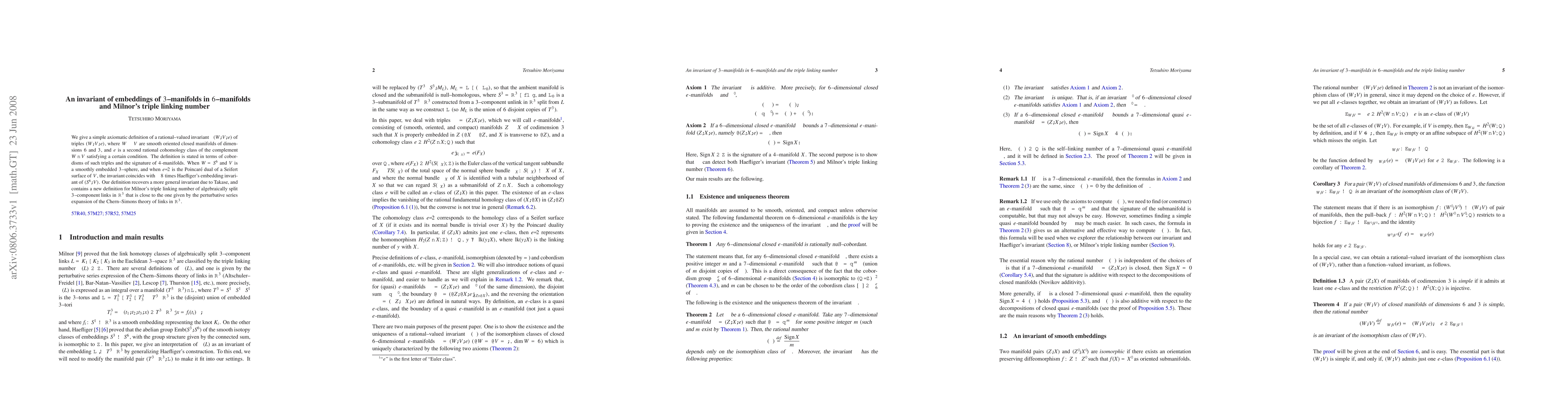 We give a simple axiomatic definition of a rational-valued invariant s(W,V,e) of triples (W,V,e), where W is a (smooth, oriented, closed) 6-manifold and V is a 3-submanifold of W, and where e is a second rational cohomology class of the complement of V satisfying a certain condition. The definition is stated in terms of cobordisms of such triples and the signature of 4-manifolds. When W = S^6 and V is a smoothly embedded 3-sphere, and when e/2 is the Poincare dual of a Seifert surface of V, the invariant coincides with -8 times Haefliger's embedding invariant of (S^6,V). Our definition recovers a more general invariant due to Takase, and contains a new definition for Milnor's triple linking number of algebraically split 3-component links in R^3 that is close to the one given by the perturbative series expansion of the Chern-Simons theory of links in R^3.