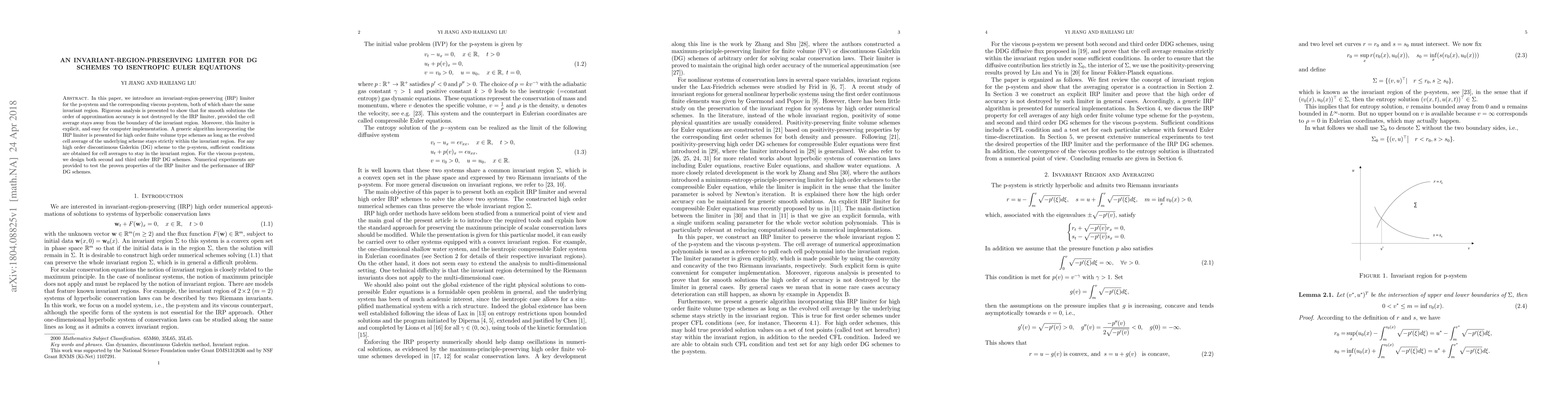 In this paper, we introduce an invariant-region-preserving (IRP) limiter for the p-system and the corresponding viscous p-system, both of which share the same invariant region. Rigorous analysis is presented to show that for smooth solutions the order of approximation accuracy is not destroyed by the IRP limiter, provided the cell average stays away from the boundary of the invariant region. Moreover, this limiter is explicit, and easy for computer implementation. A generic algorithm incorporating the IRP limiter is presented for high order finite volume type schemes as long as the evolved cell average of the underlying scheme stays strictly within the invariant region. For any high order discontinuous Galerkin (DG) scheme to the p-system, sufficient conditions are obtained for cell averages to stay in the invariant region. For the viscous p-system, we design both second and third order IRP DG schemes. Numerical experiments are provided to test the proven properties of the IRP limiter and the performance of IRP DG schemes.