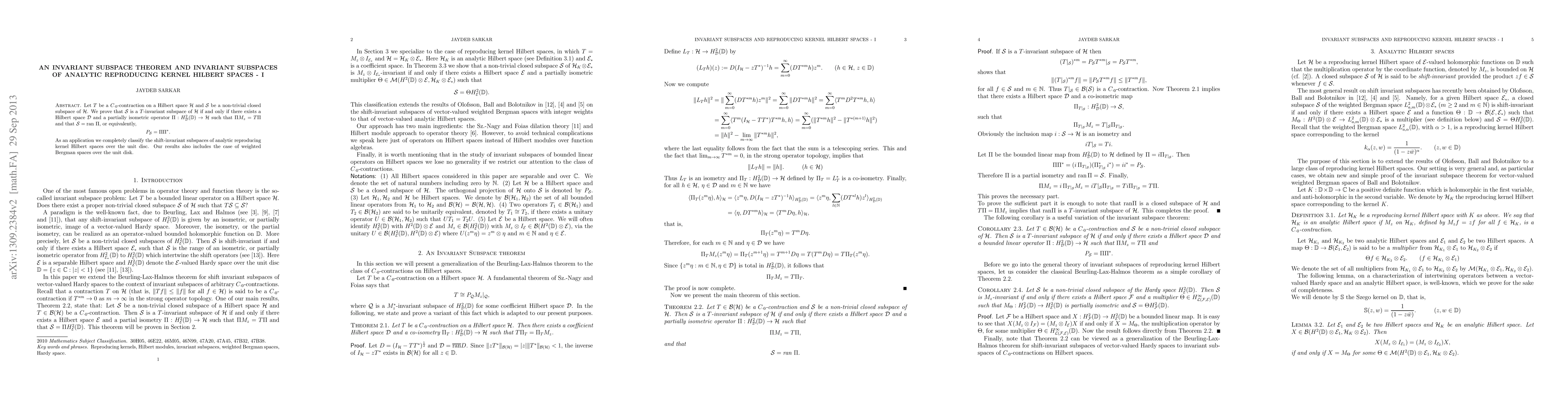 This paper proves an invariant subspace theorem for C_{\cdot 0}-contractions on Hilbert spaces, showing that a subspace is T-invariant if there exists a specific partially isometric operator. It also classifies shift-invariant subspaces in analytic reproducing kernel Hilbert spaces over the unit disc, including weighted Bergman spaces.
