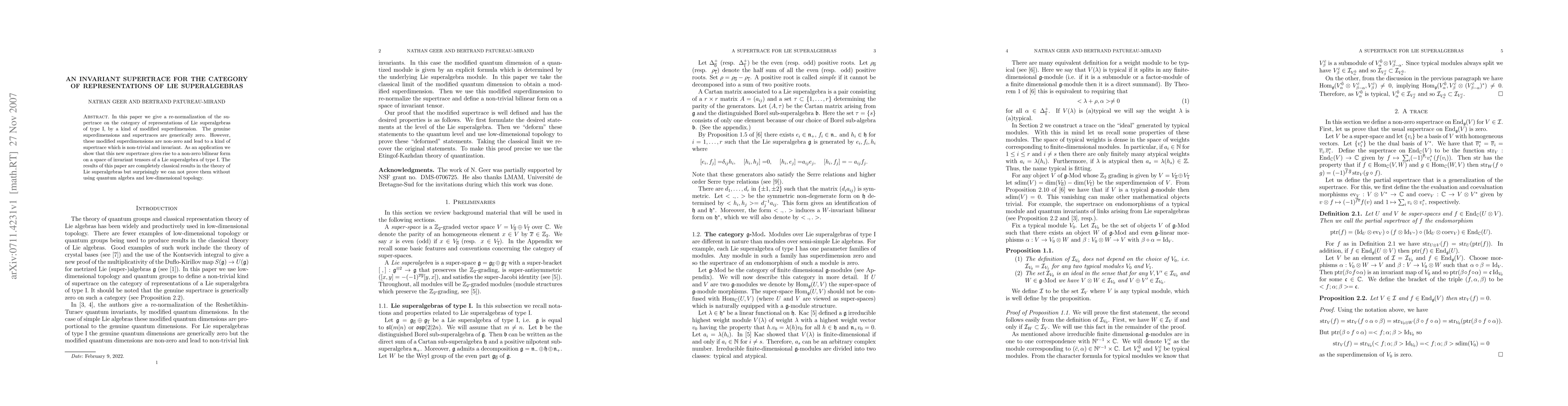 This paper introduces a re-normalized supertrace for representations of type I Lie superalgebras, using modified superdimensions that are non-zero and invariant. It also demonstrates the application of this new supertrace in generating a non-zero bilinear form on invariant tensors, leveraging insights from quantum algebra and low-dimensional topology.