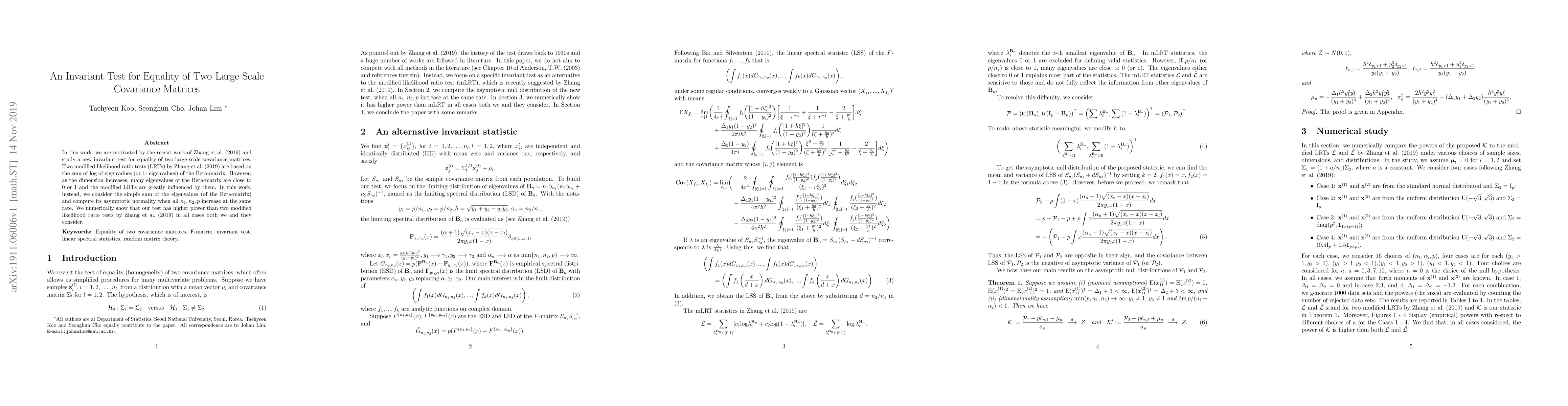 In this work, we are motivated by the recent work of Zhang et al. (2019) and study a new invariant test for equality of two large scale covariance matrices. Two modified likelihood ratio tests (LRTs) by Zhang et al. (2019) are based on the sum of log of eigenvalues (or 1- eigenvalues) of the Beta-matrix. However, as the dimension increases, many eigenvalues of the Beta-matrix are close to 0 or 1 and the modified LRTs are greatly influenced by them. In this work, instead, we consider the simple sum of the eigenvalues (of the Beta-matrix) and compute its asymptotic normality when all $n_1, n_2, p$ increase at the same rate. We numerically show that our test has higher power than two modified likelihood ratio tests by Zhang et al. (2019) in all cases both we and they consider.