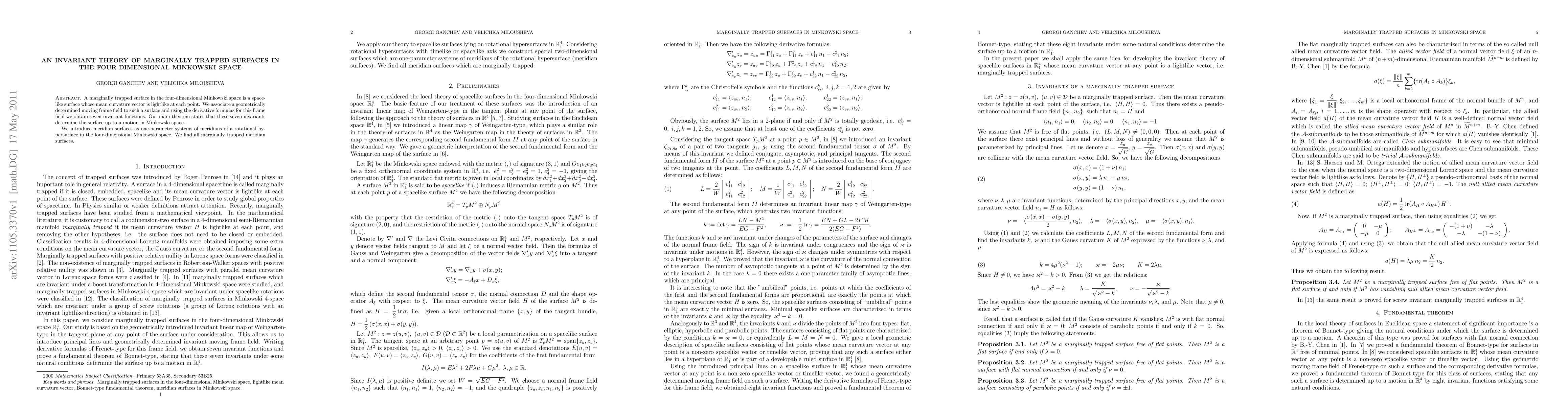 Summary: This paper explores the geometry of marginally trapped surfaces in four-dimensional Minkowski space, identifying seven invariant functions that uniquely determine such surfaces up to motion, and characterizes meridian surfaces as one-parameter systems of meridians of rotational hypersurfaces.
