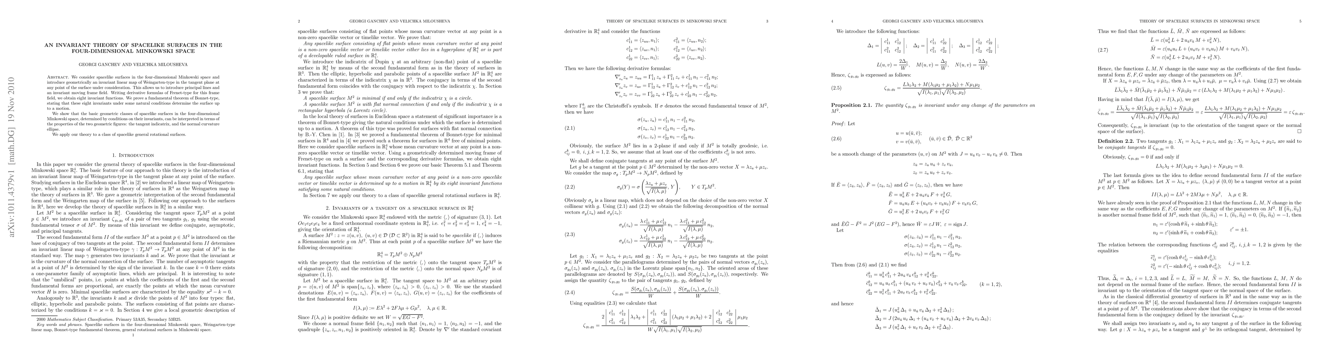 This paper develops an invariant theory for spacelike surfaces in four-dimensional Minkowski space, introducing an invariant linear map and deriving eight invariant functions. It proves a Bonnet-type theorem asserting that these invariants determine the surface up to motion, and applies the theory to spacelike general rotational surfaces.