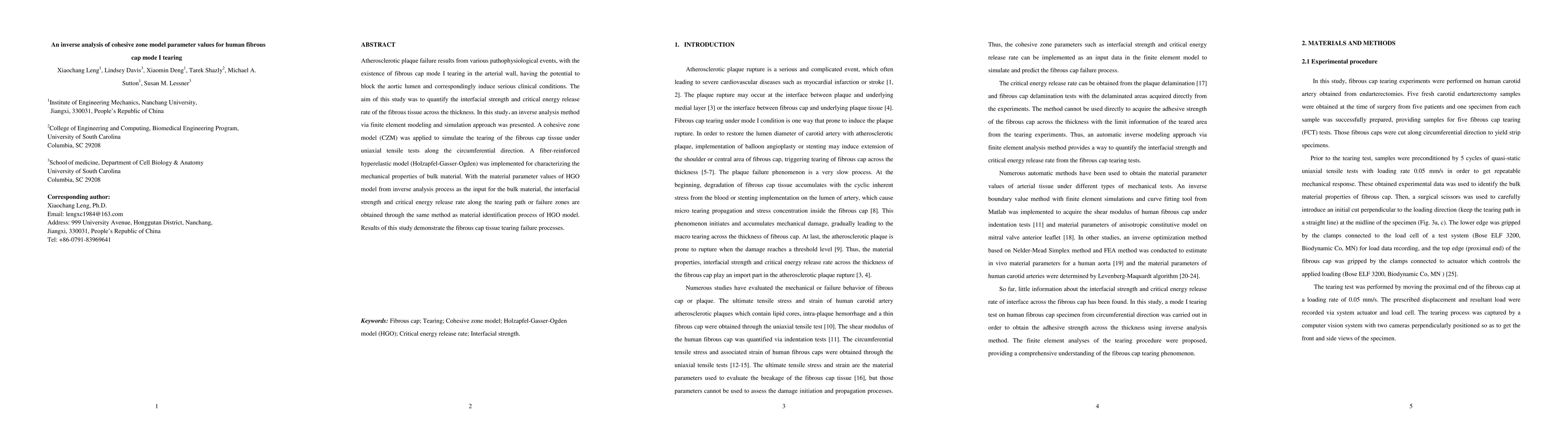 This study employs an inverse analysis method using finite element modeling to determine the cohesive zone model parameters for simulating fibrous cap mode I tearing in atherosclerotic plaques. The research identifies the interfacial strength and critical energy release rate, revealing the failure processes of fibrous cap tissue under tensile stress.