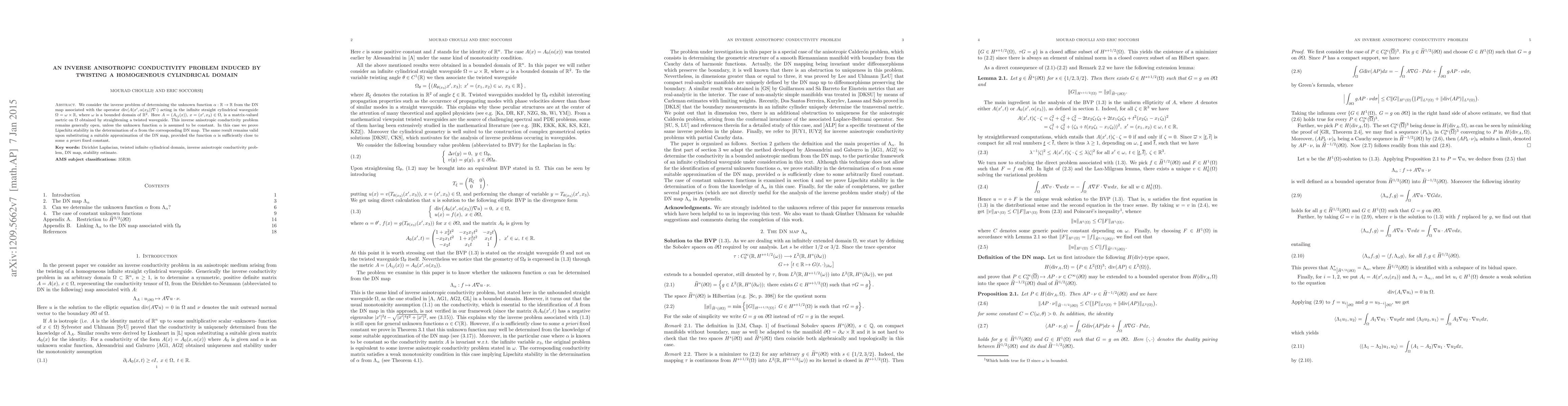 This research paper tackles the inverse anisotropic conductivity problem within a twisted cylindrical domain, proving Lipschitz stability in determining the unknown function α from the DN map when α is assumed constant. The study also validates this result using an approximation of the DN map for α close to a fixed constant.