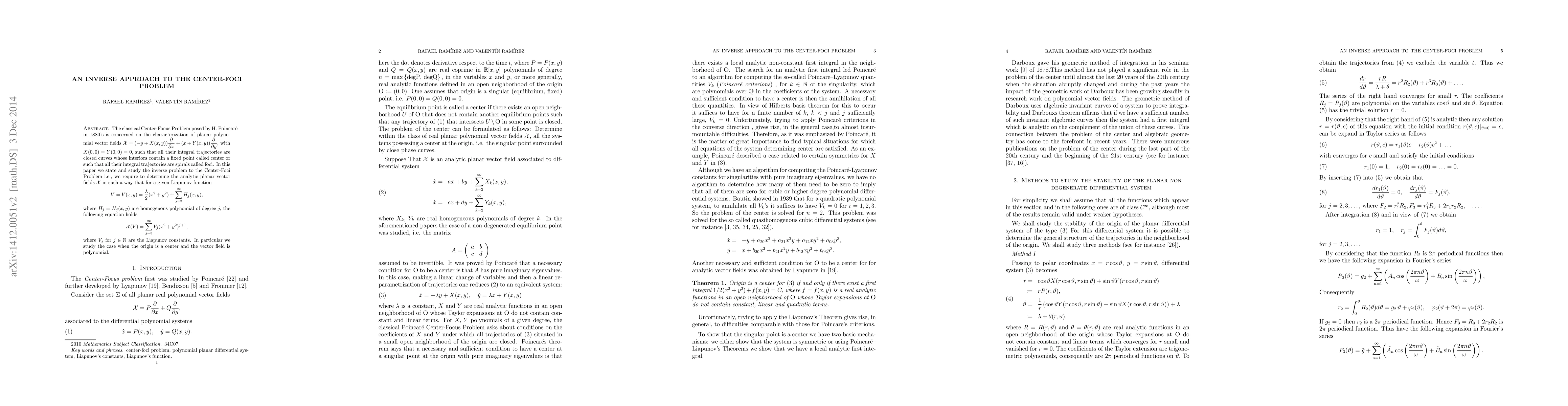 The classical Center-Focus Problem posed by H. Poincar\'e in 1880's is concerned on the characterization of planar polynomial vector fields $X=(-y+P(x,y))\dfrac{\partial}{\partial x}+(x+Q(x,y))\dfrac{\partial}{\partial y},$ with $P(0,0)=Q(0,0)=0,$ such that all their integral trajectories are closed curves whose interiors contain a fixed point called center or such that all their integral trajectories are spirals called foci. In this paper we state and study the inverse problem to the Center-Foci Problem i.e., we require to determine the analytic planar vector fields $X$ in such a way that for a given Liapunov function \[V=V(x,y)=\dfrac{\lambda}{2}(x^2+y^2)+\displaystyle\sum_{j=3}^{\infty} H_j(x,y),\] where $H_j=H_j(x,y)$ are homogenous polynomial of degree $j,$ the following equation holds \[X(V)=\displaystyle\sum_{j=3}^{\infty}V_j(x^2+y^2)^{j+1}, \] where $V_j$ for $j\in\mathbb{N}$ are the Liapunov constants. In particular we study the case when the origin is a center and the vector field is polynomial.