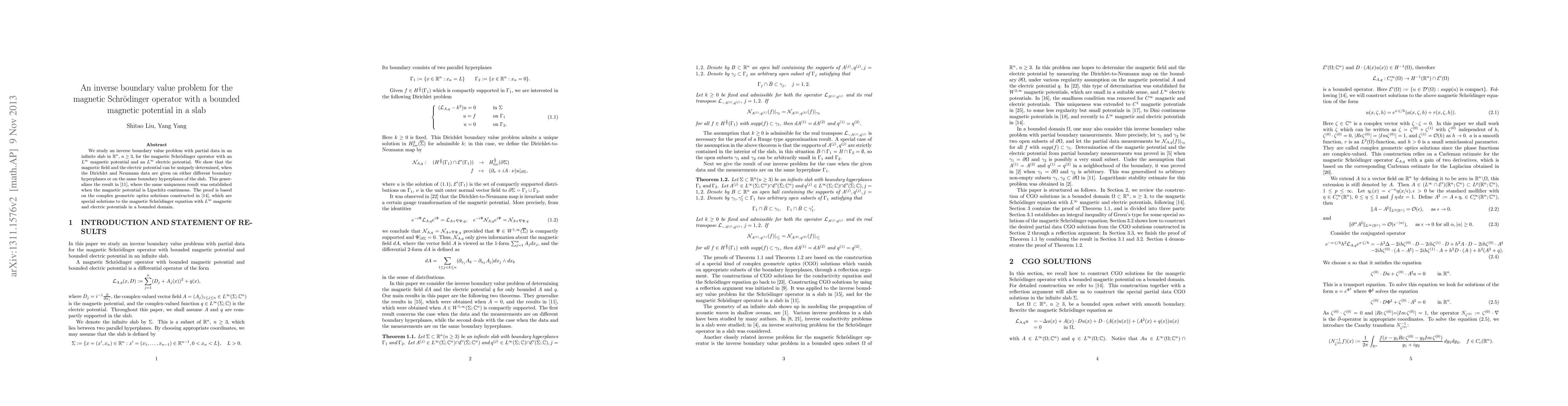 This paper addresses an inverse boundary value problem for the magnetic Schrödinger operator in an infinite slab, demonstrating that the magnetic field and electric potential can be uniquely determined from partial Dirichlet and Neumann data. The result extends previous work by allowing for $L^{\infty}$ magnetic potentials, rather than just Lipschitz continuous ones, using complex geometric optics solutions.