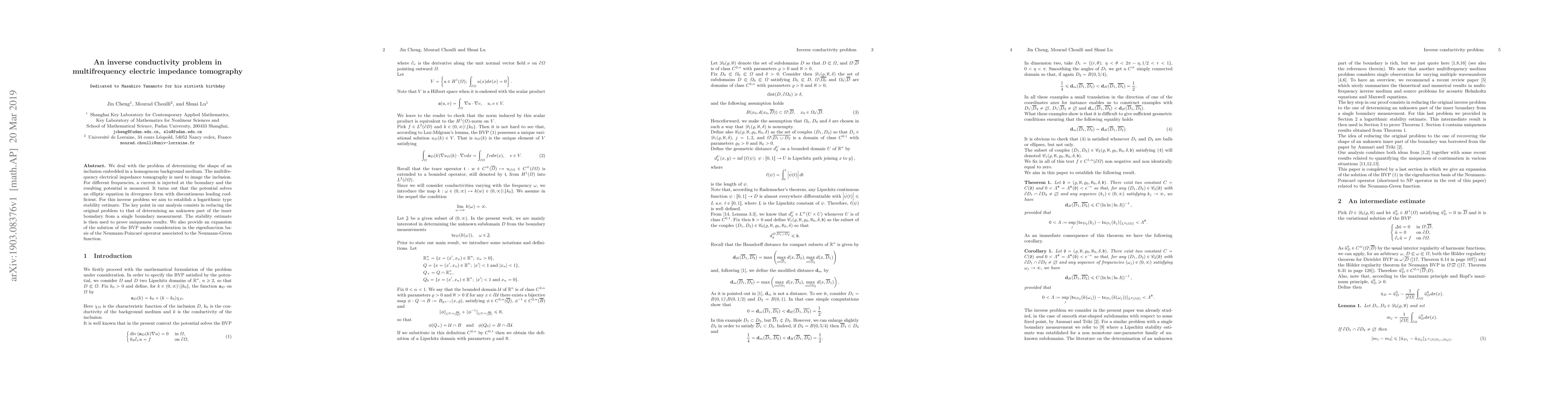 We deal with the problem of determining the shape of an inclusion embedded in a homogenous background medium. The multifre-quency electrical impedance tomography is used to image the inclusion. For different frequencies, a current is injected at the boundary and the resulting potential is measured. It turns out that the potential solves an elliptic equation in divergence form with discontinuous leading coefficient. For this inverse problem we aim to establish a logarithmic type stability estimate. The key point in our analysis consists in reducing the original problem to that of determining an unknown part of the inner boundary from a single boundary measurment. The stability estimate is then used to prove uniqueness results. We also provide an expansion of the solution of the BVP under consideration in the eigenfunction basis of the Neumann-Poincar{\'e} operator associated to the Neumann-Green function.