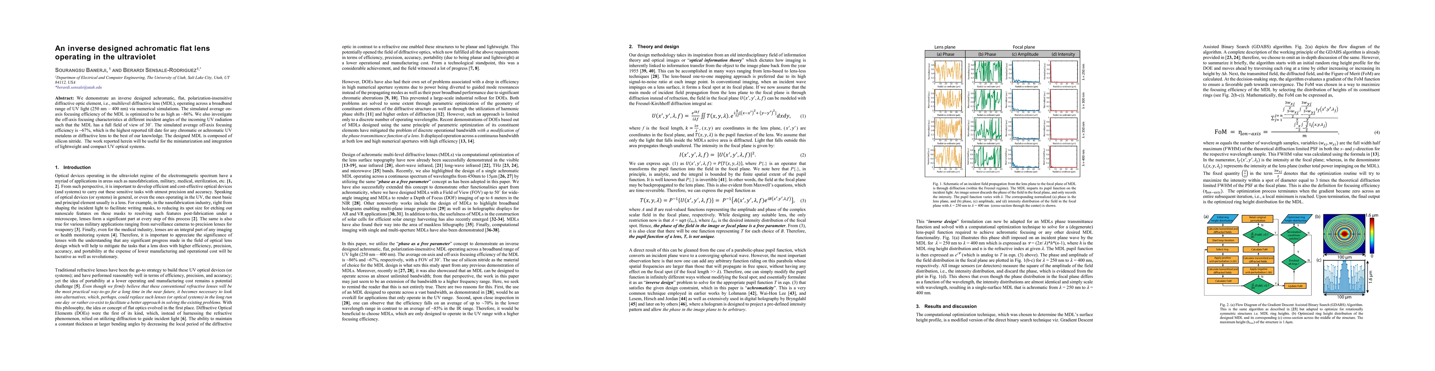 This research presents an inverse designed achromatic flat lens, called a multilevel diffractive lens (MDL), optimized for ultraviolet light focusing with an on-axis efficiency of ~86% and an off-axis efficiency of ~67%, the highest reported for such lenses. The MDL, made of silicon nitride, offers a full field of view of 30 degrees and is promising for miniaturized UV optical systems.