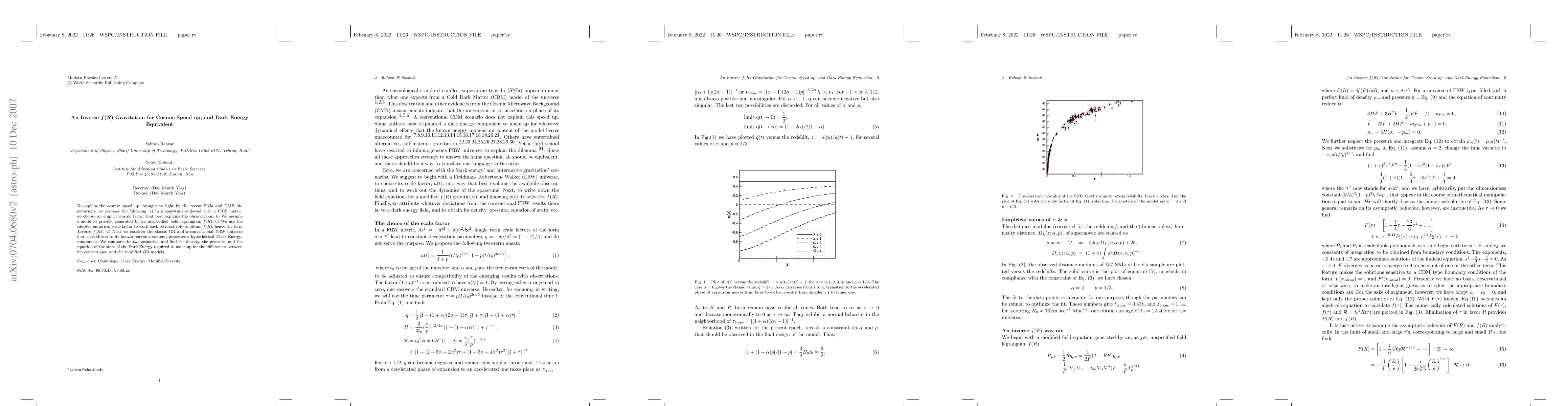 To explain the cosmic speed up, brought to light by the recent SNIa and CMB observations, we propose the following: a) In a spacetime endowed with a FRW metric, we choose an empirical scale factor that best explains the observations. b) We assume a modified gravity, generated by an unspecified field lagrangian, $f(R)$. c) We use the adopted empirical scale factor to work back retroactively to obtain $f(R)$, hence the term `Inverse $f(R)$'. d) Next we consider the classic GR and a conventional FRW universe that, in addition to its known baryonic content, possesses a hypothetical `Dark Energy' component. We compare the two scenarios, and find the density, the pressure, and the equation of the state of the Dark Energy required to make up for the differences between the conventional and the modified GR models.