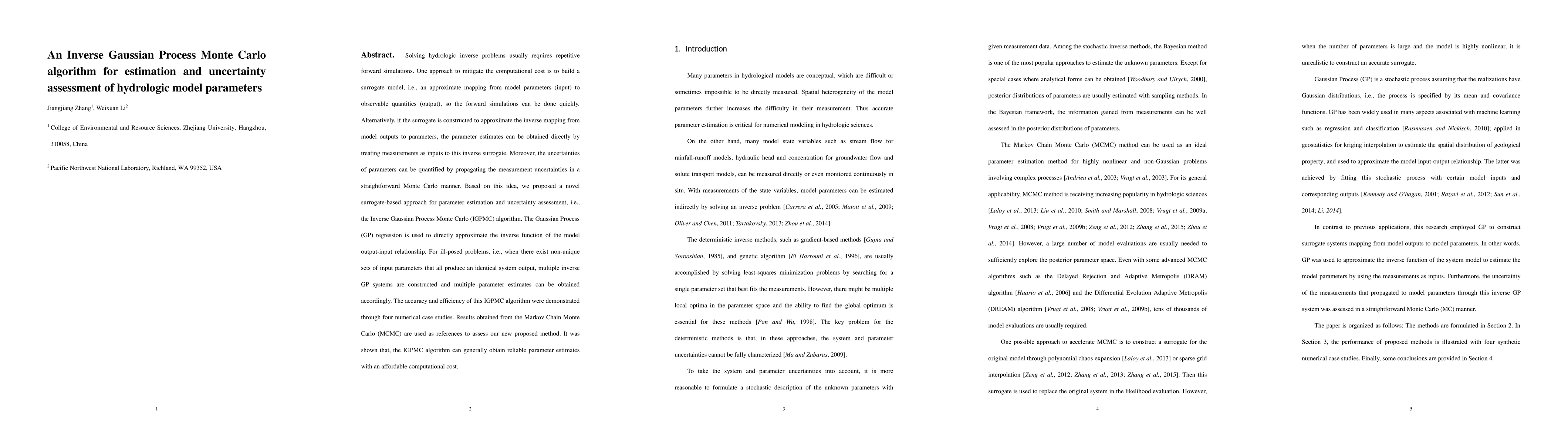 The paper proposes an Inverse Gaussian Process Monte Carlo (IGPMC) algorithm for estimating hydrologic model parameters and assessing their uncertainties efficiently. The IGPMC algorithm uses Gaussian Process regression to approximate the inverse mapping from outputs to parameters, demonstrating accuracy and efficiency through numerical case studies compared to Markov Chain Monte Carlo.