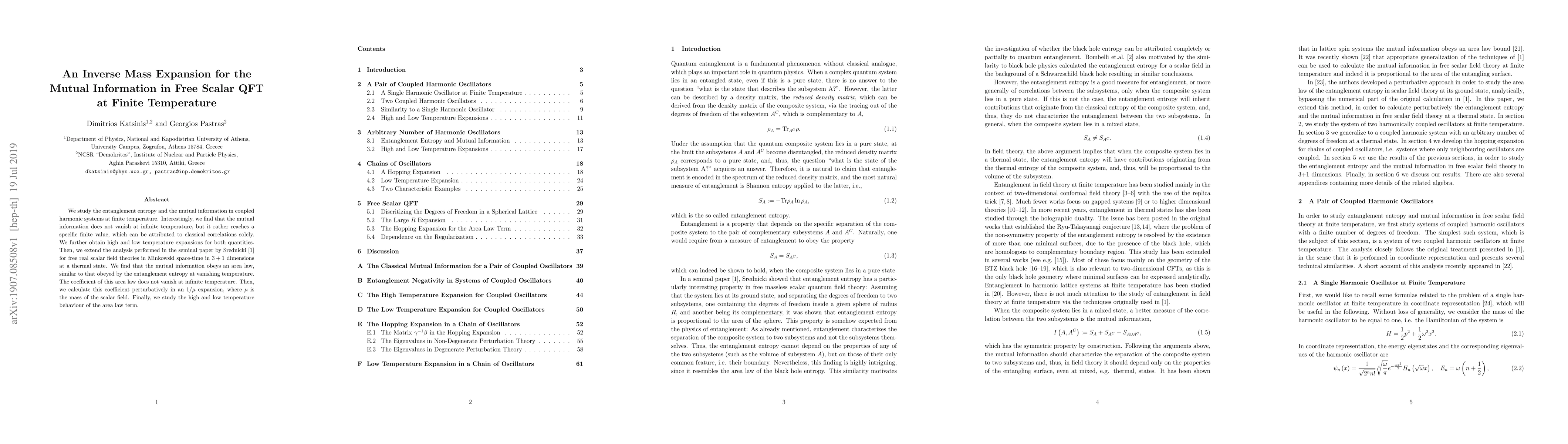 We study the entanglement entropy and the mutual information in coupled harmonic systems at finite temperature. Interestingly, we find that the mutual information does not vanish at infinite temperature, but it rather reaches a specific finite value, which can be attributed to classical correlations solely. We further obtain high and low temperature expansions for both quantities. Then, we extend the analysis performed in the seminal paper by Srednicki (Phys. Rev. Lett. 71, 666 (1993)) for free real scalar field theories in Minkowski space-time in 3+1 dimensions at a thermal state. We find that the mutual information obeys an area law, similar to that obeyed by the entanglement entropy at vanishing temperature. The coefficient of this area law does not vanish at infinite temperature. Then, we calculate this coefficient perturbatively in an $1/\mu$ expansion, where $\mu$ is the mass of the scalar field. Finally, we study the high and low temperature behaviour of the area law term.
