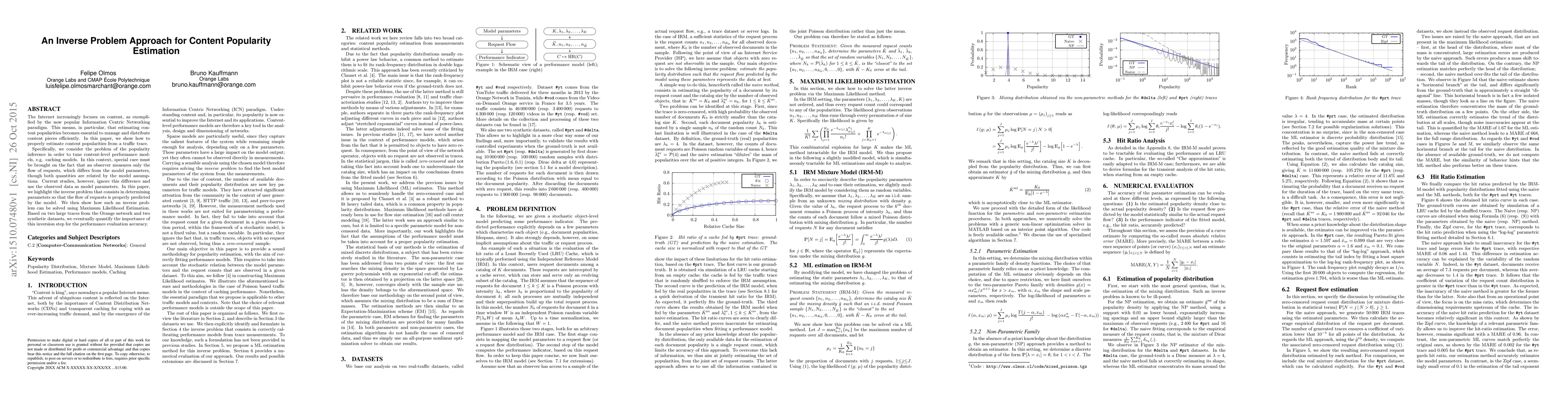 This paper proposes an inverse problem approach to accurately estimate content popularity from traffic traces, addressing the discrepancy between observed request flows and model parameters. It utilizes Maximum Likelihood Estimation to solve this inverse problem, demonstrating improved performance model accuracy through large-scale network trace analysis.