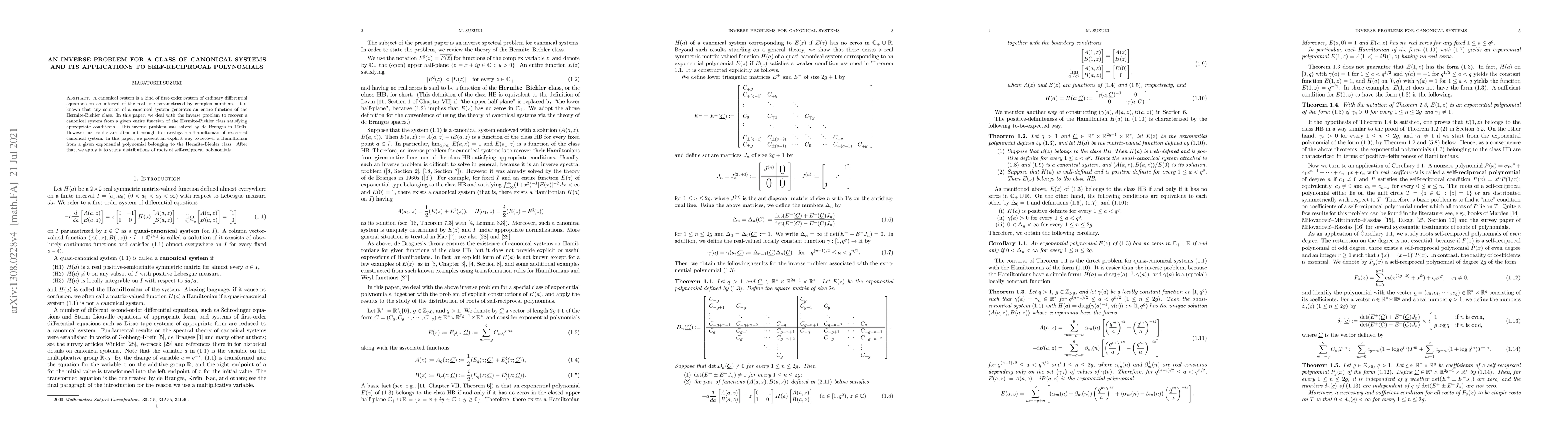 Researchers developed an explicit method to recover a Hamiltonian from a given entire function of the Hermite-Biehler class, enabling the study of distributions of roots of self-reciprocal polynomials.