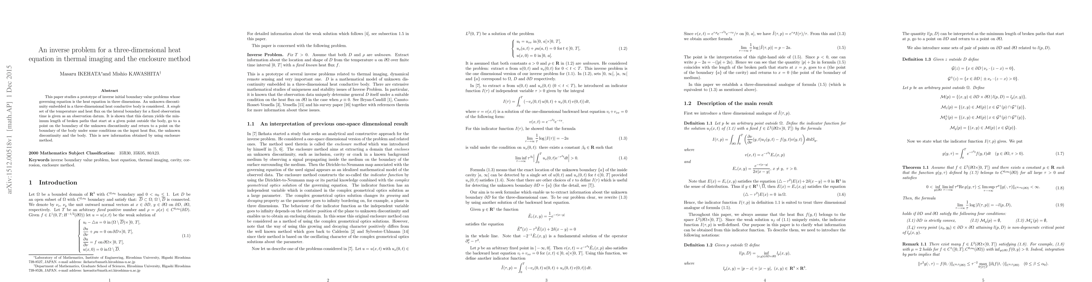 This paper studies a prototype of inverse initial boundary value problems whose governing equation is the heat equation in three dimensions. An unknown discontinuity embedded in a three-dimensional heat conductive body is considered. A {\it single} set of the temperature and heat flux on the lateral boundary for a fixed observation time is given as an observation datum. It is shown that this datum yields the minimum length of broken paths that start at a given point outside the body, go to a point on the boundary of the unknown discontinuity and return to a point on the boundary of the body under some conditions on the input heat flux, the unknown discontinuity and the body. This is new information obtained by using enclosure method.