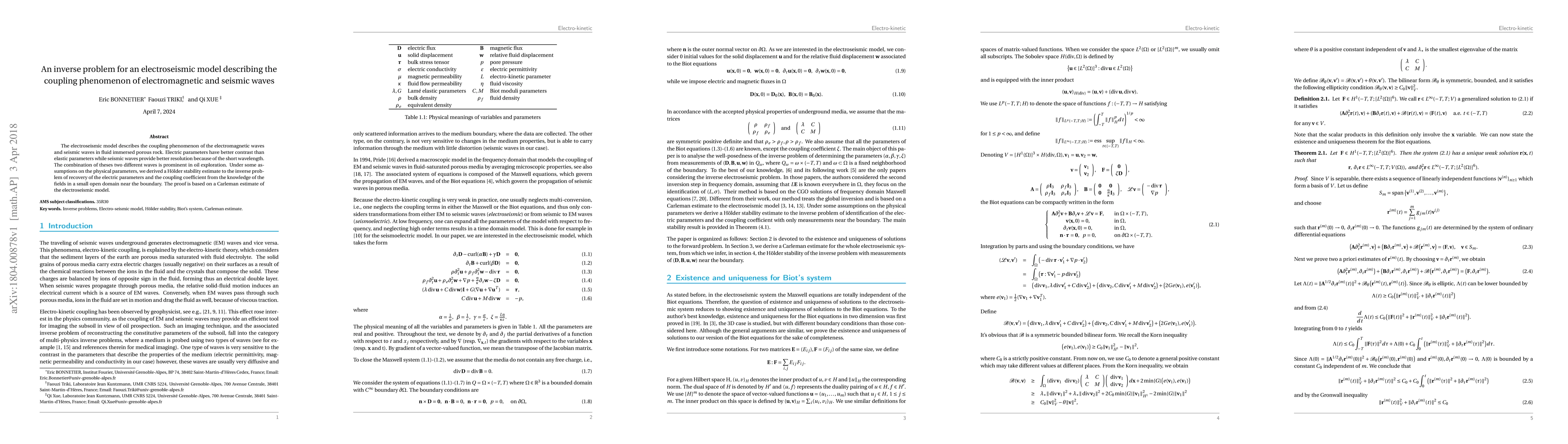 This paper addresses an inverse problem for an electroseismic model that captures the coupling between electromagnetic and seismic waves in fluid-immersed porous rock, focusing on the recovery of electric parameters and the coupling coefficient. A H\"older stability estimate is derived using a Carleman estimate, demonstrating the potential of combining these waves for enhanced oil exploration.
