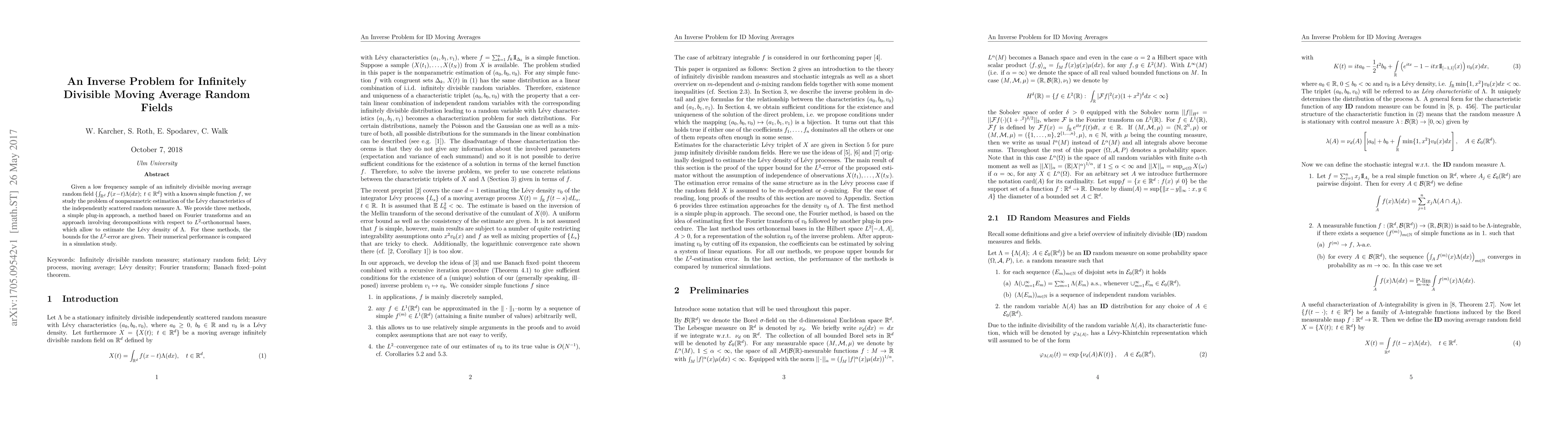 This research paper presents methods for estimating the Lvy characteristics of an infinitely divisible moving average random field from a low-frequency sample, with bounds on the error and a comparison in simulation studies.