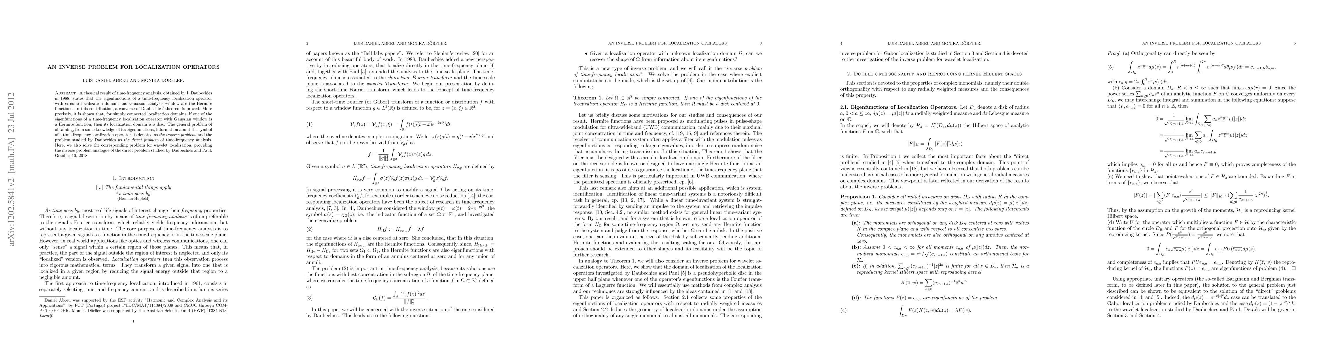 A classical result of time-frequency analysis, obtained by I. Daubechies in 1988, states that the eigenfunctions of a time-frequency localization operator with circular localization domain and Gaussian analysis window are the Hermite functions. In this contribution, a converse of Daubechies' theorem is proved. More precisely, it is shown that, for simply connected localization domains, if one of the eigenfunctions of a time-frequency localization operator with Gaussian window is a Hermite function, then its localization domain is a disc. The general problem of obtaining, from some knowledge of its eigenfunctions, information about the symbol of a time-frequency localization operator, is denoted as the inverse problem, and the problem studied by Daubechies as the direct problem of time-frequency analysis. Here, we also solve the corresponding problem for wavelet localization, providing the inverse problem analogue of the direct problem studied by Daubechies and Paul.