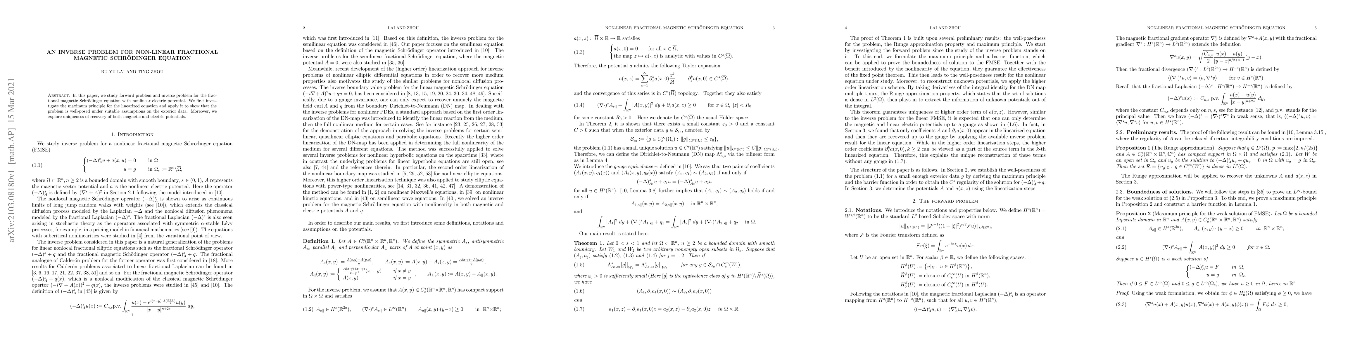 This paper investigates the forward and inverse problems of a fractional magnetic Schrödinger equation with nonlinear electric potential, establishing well-posedness via the maximum principle and exploring the uniqueness of recovering both magnetic and electric potentials.