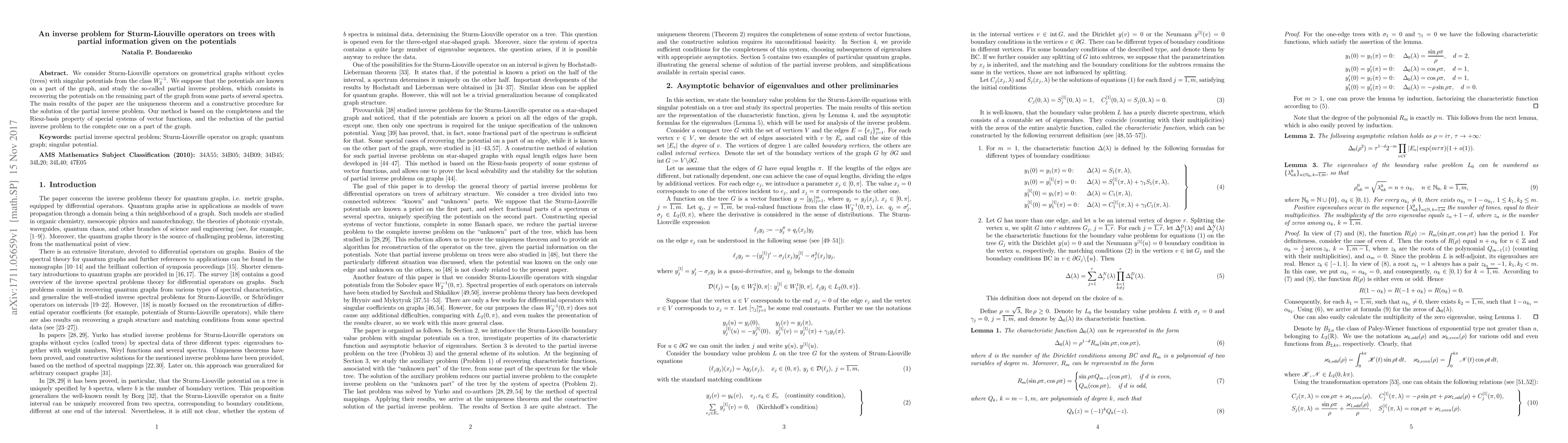 This paper addresses the partial inverse problem for Sturm-Liouville operators on tree-like graphs, focusing on recovering unknown potentials from known spectral data. The authors prove a uniqueness theorem and provide a constructive solution method based on vector function systems' completeness and Riesz-basis properties.