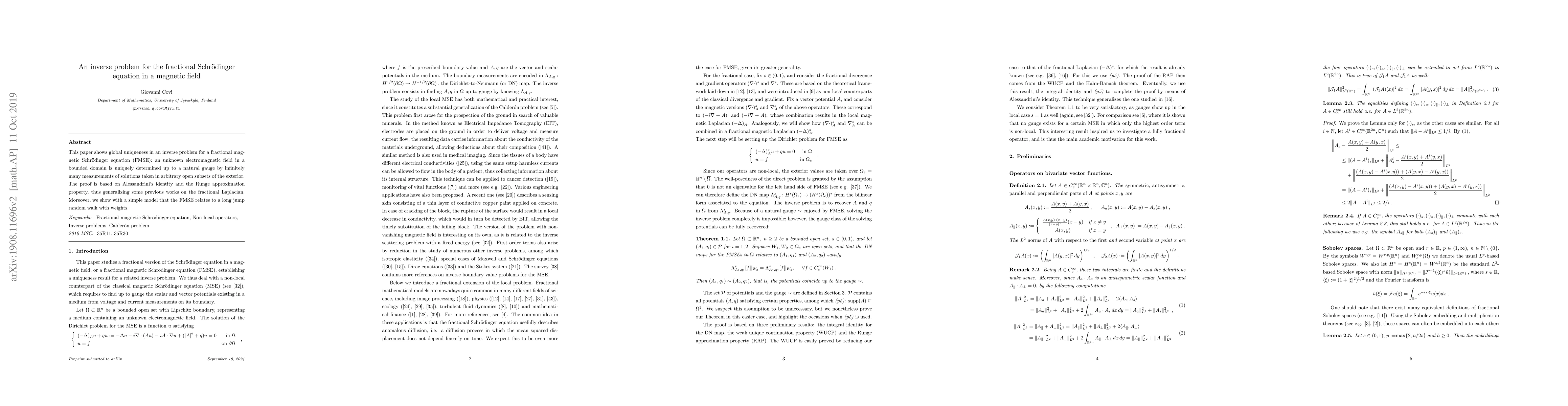 This paper demonstrates global uniqueness in determining an unknown electromagnetic field in a bounded domain from measurements of solutions to the fractional magnetic Schrödinger equation, using Alessandrini's identity and Runge approximation. It also connects the fractional magnetic Schrödinger equation to a long jump random walk model.
