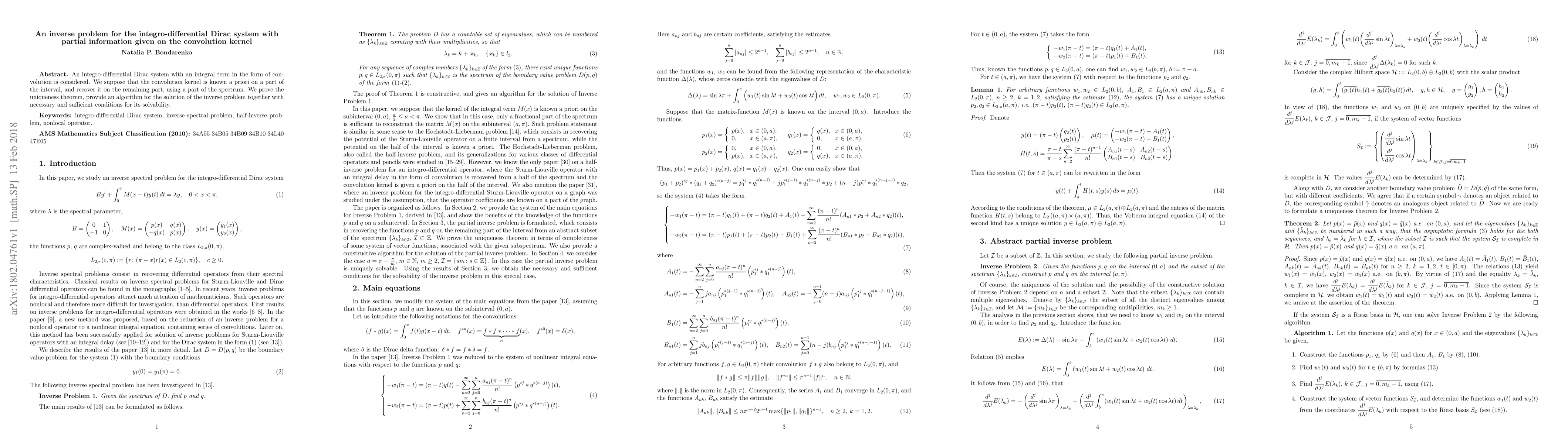 This paper addresses an inverse problem for an integro-differential Dirac system where part of the convolution kernel is known. It proves a uniqueness theorem and presents an algorithm to recover the unknown part of the kernel using spectral data, along with the necessary and sufficient conditions for the problem's solvability.