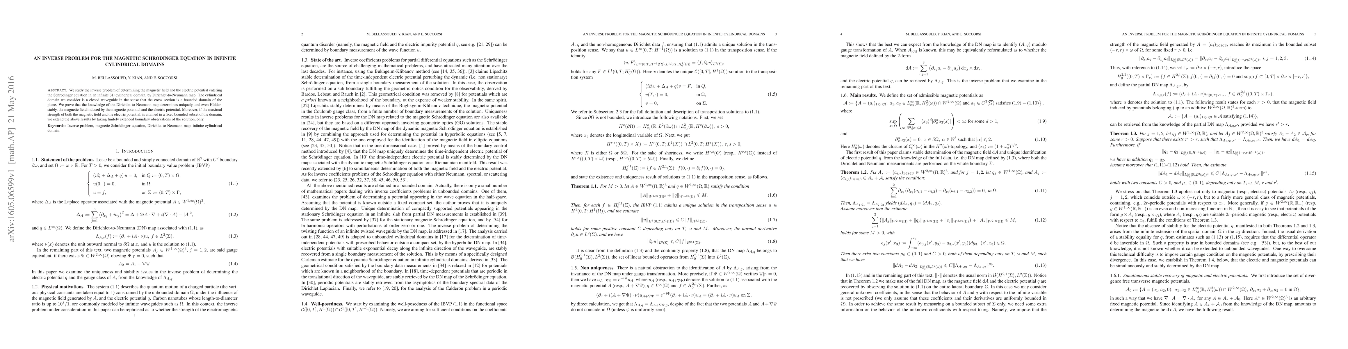 This paper addresses the inverse problem of identifying the magnetic field and electric potential in an infinite cylindrical domain using the Dirichlet-to-Neumann map. The authors prove that the map uniquely and Hölder-stably determines these potentials, with extended results applicable to finitely extended boundary observations when the potentials' maximum strengths are confined to a fixed subset.