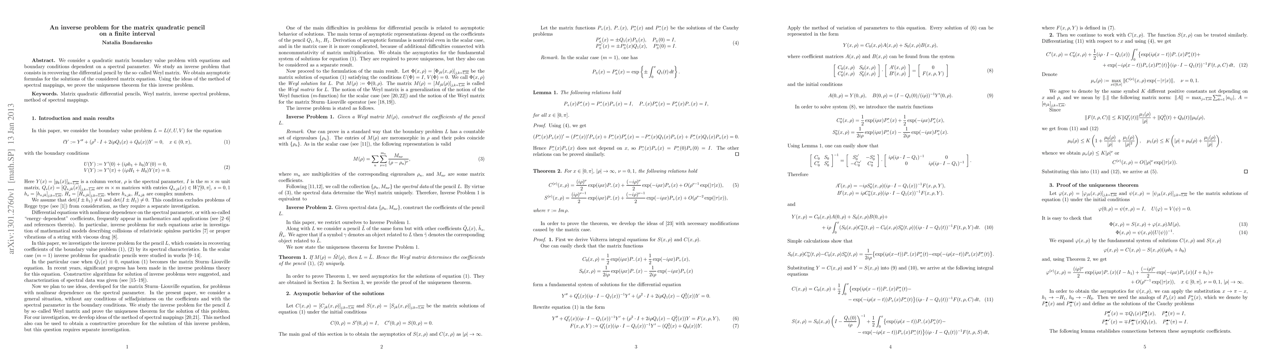 This paper investigates an inverse problem for a quadratic matrix boundary value problem, focusing on recovering the differential pencil from a Weyl matrix. It establishes asymptotic solutions for the matrix equation and proves a uniqueness theorem using spectral mapping techniques.