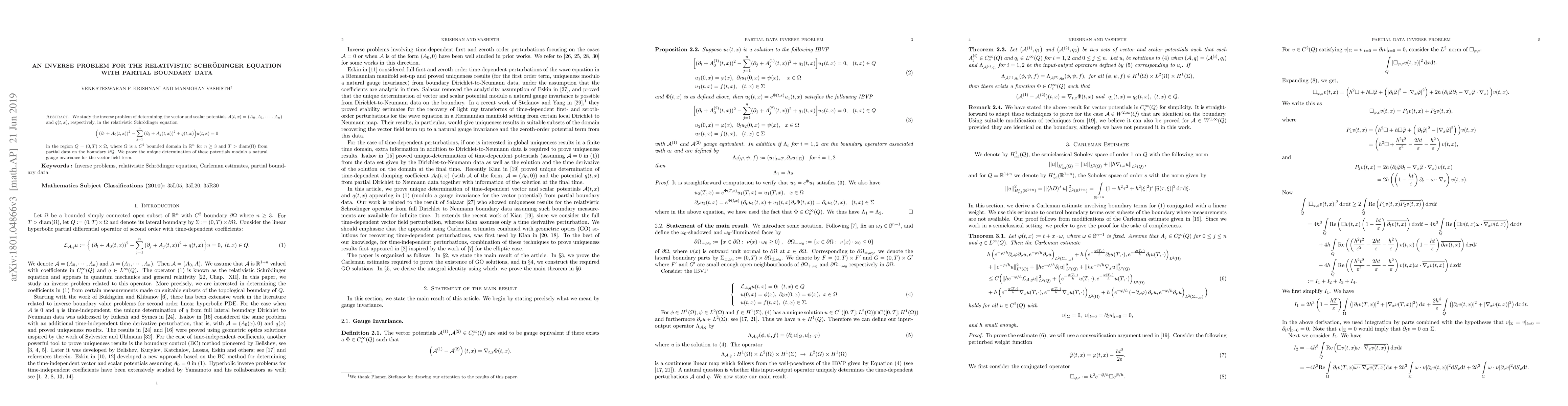 This paper investigates the inverse problem of identifying vector and scalar potentials in the relativistic Schrödinger equation using partial boundary data. The authors prove the unique determination of these potentials, up to a gauge invariance for the vector field, from boundary measurements in a bounded domain.