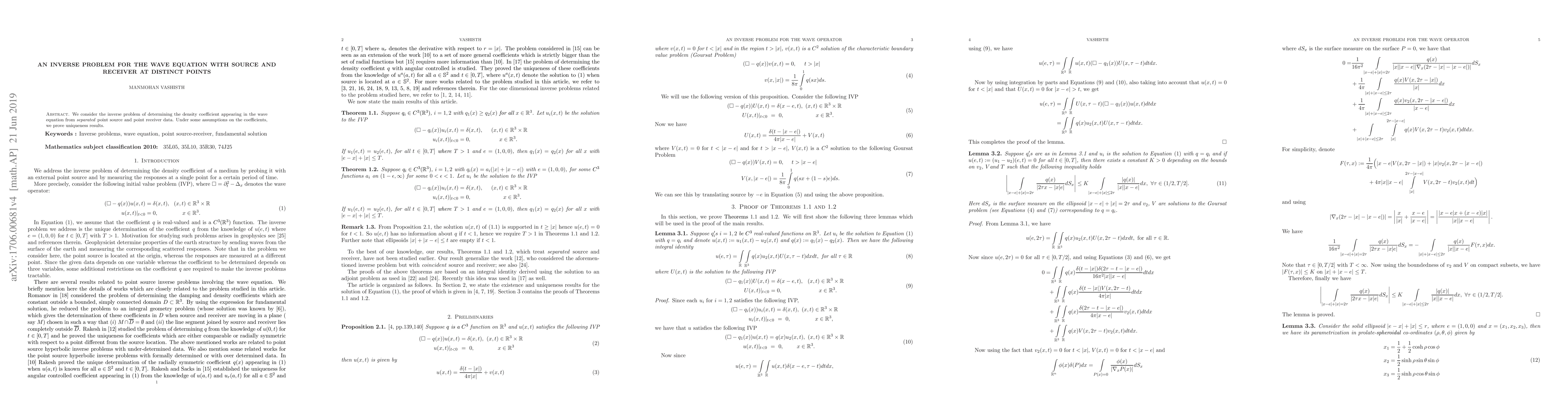 Researchers solve an inverse problem for a wave equation to determine a density coefficient based on data from a source and receiver at distinct points, proving uniqueness results under certain assumptions.