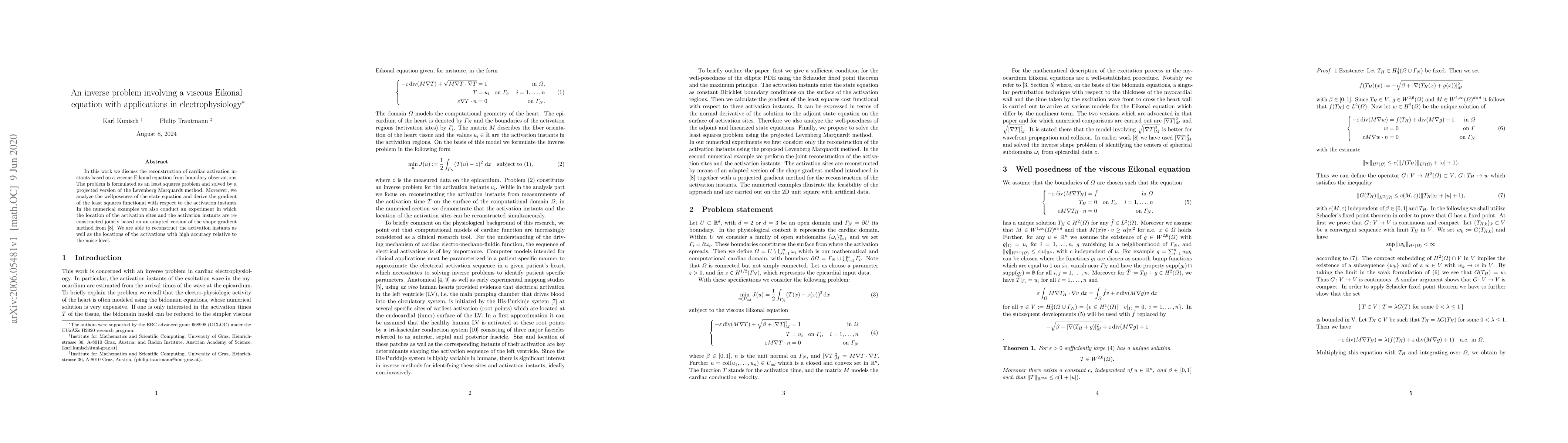 In this work we discuss the reconstruction of cardiac activation instants based on a viscous Eikonal equation from boundary observations. The problem is formulated as an least squares problem and solved by a projected version of the Levenberg Marquardt method. Moreover, we analyze the wellposeness of the state equation and derive the gradient of the least squares functional with respect to the activation instants. In the numerical examples we also conduct an experiment in which the location of the activation sites and the activation instants are reconstructed jointly based on an adapted version of the shape gradient method from https://link.springer.com/article/10.1007/s00285-019-01419-3. We are able to reconstruct the activation instants as well as the locations of the activations with high accuracy relative to the noise level.