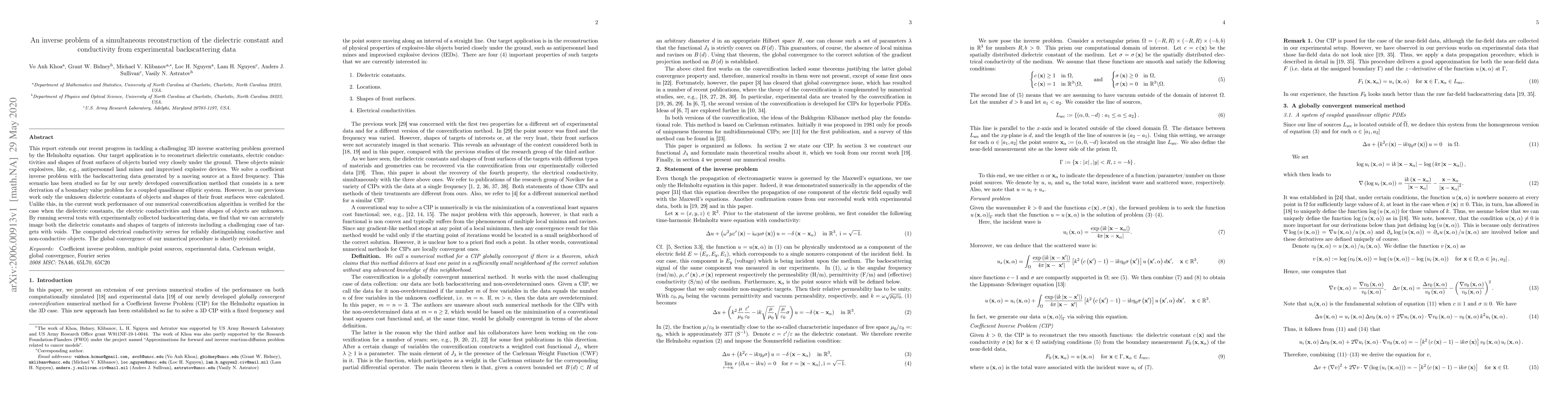 This report extends our recent progress in tackling a challenging 3D inverse scattering problem governed by the Helmholtz equation. Our target application is to reconstruct dielectric constants, electric conductivities and shapes of front surfaces of objects buried very closely under the ground. These objects mimic explosives, like, e.g., antipersonnel land mines and improvised explosive devices. We solve a coefficient inverse problem with the backscattering data generated by a moving source at a fixed frequency. This scenario has been studied so far by our newly developed convexification method that consists in a new derivation of a boundary value problem for a coupled quasilinear elliptic system. However, in our previous work only the unknown dielectric constants of objects and shapes of their front surfaces were calculated. Unlike this, in the current work performance of our numerical convexification algorithm is verified for the case when the dielectric constants, the electric conductivities and those shapes of objects are unknown. By running several tests with experimentally collected backscattering data, we find that we can accurately image both the dielectric constants and shapes of targets of interests including a challenging case of targets with voids. The computed electrical conductivity serves for reliably distinguishing conductive and non-conductive objects. The global convergence of our numerical procedure is shortly revisited.