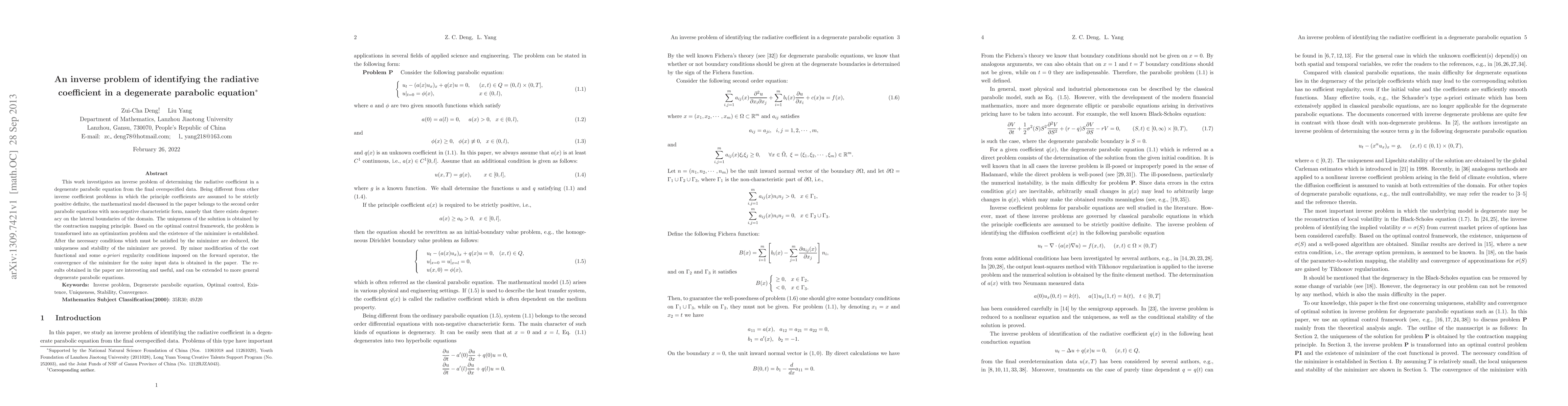 This paper addresses the inverse problem of identifying the radiative coefficient in a degenerate parabolic equation using final overspecified data. It establishes the uniqueness and stability of the solution through the contraction mapping principle and optimal control framework, proving convergence under noisy data conditions.