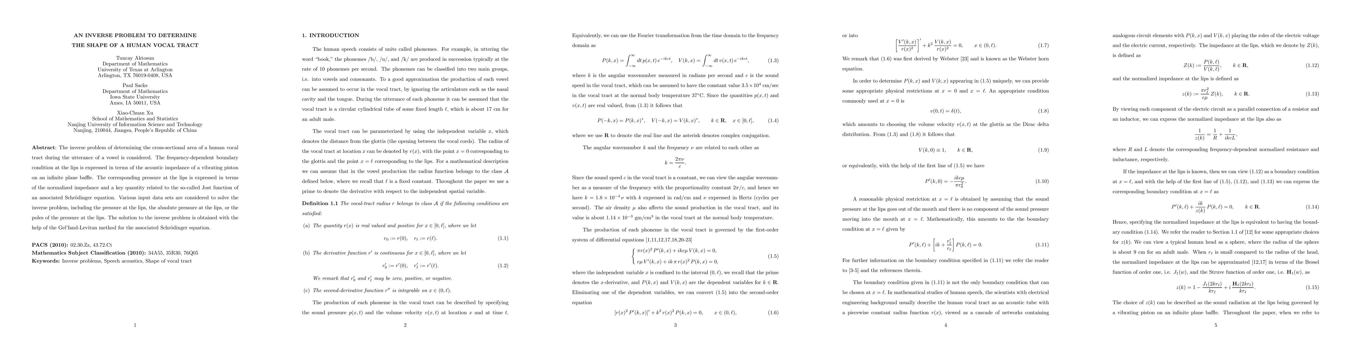 The inverse problem of determining the cross-sectional area of a human vocal tract during the utterance of a vowel is considered. The frequency-dependent boundary condition at the lips is expressed in terms of the acoustic impedance of a vibrating piston on an infinite plane baffle. The corresponding pressure at the lips is expressed in terms of the normalized impedance and a key quantity related to the so-called Jost function of an associated Schr\"odinger equation. Various input data sets are considered to solve the inverse problem, including the pressure at the lips, the absolute pressure at the lips, or the poles of the pressure at the lips. The solution to the inverse problem is obtained with the help of the Gel'fand-Levitan method for the associated Schr\"odinger equation.