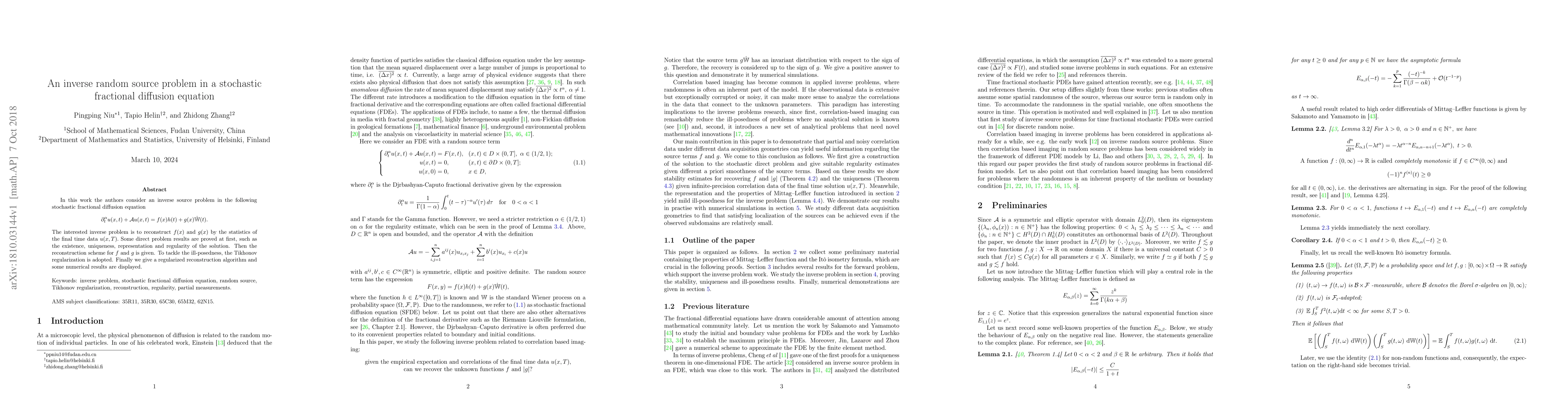 This paper addresses an inverse source problem in a stochastic fractional diffusion equation, aiming to reconstruct functions $f(x)$ and $g(x)$ using final time data statistics. The authors first establish existence, uniqueness, and regularity of the solution, then propose a Tikhonov regularization method to tackle ill-posedness, and finally present a reconstruction algorithm with numerical results.